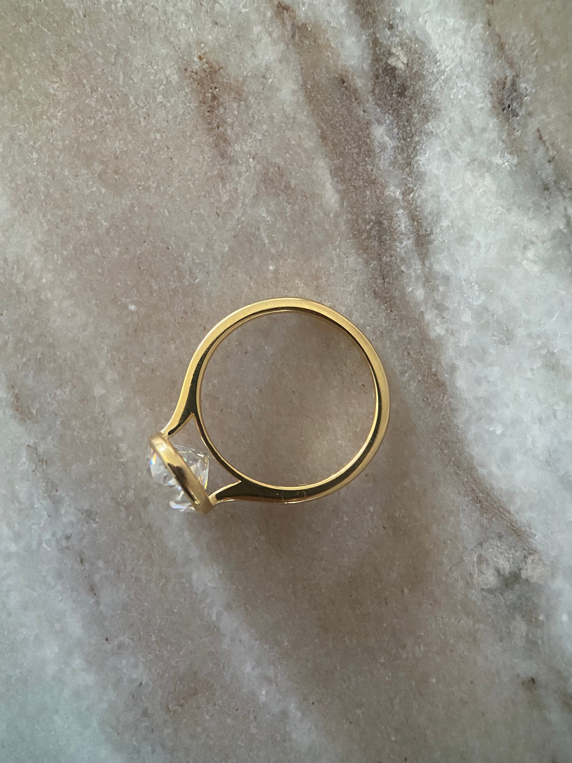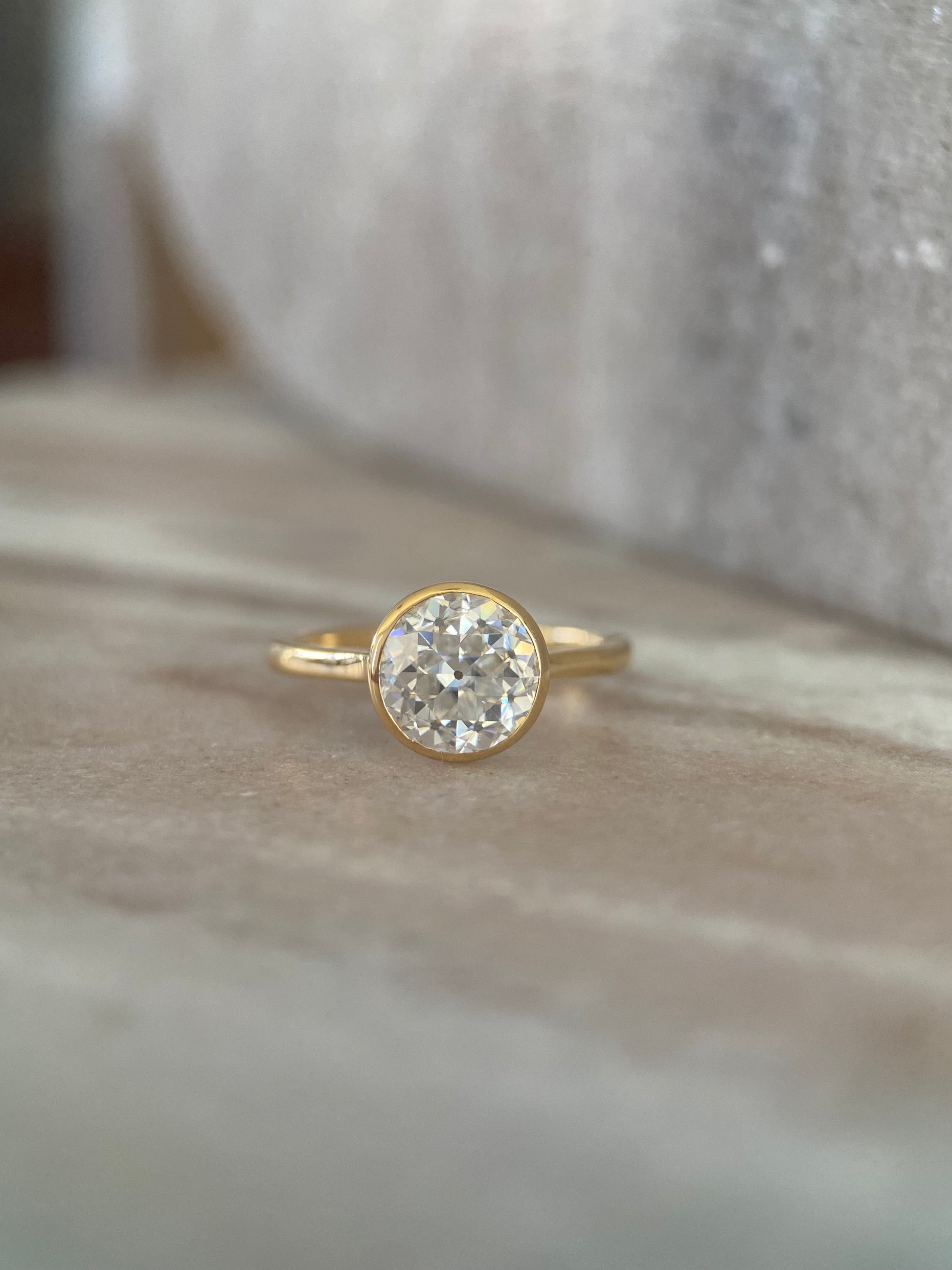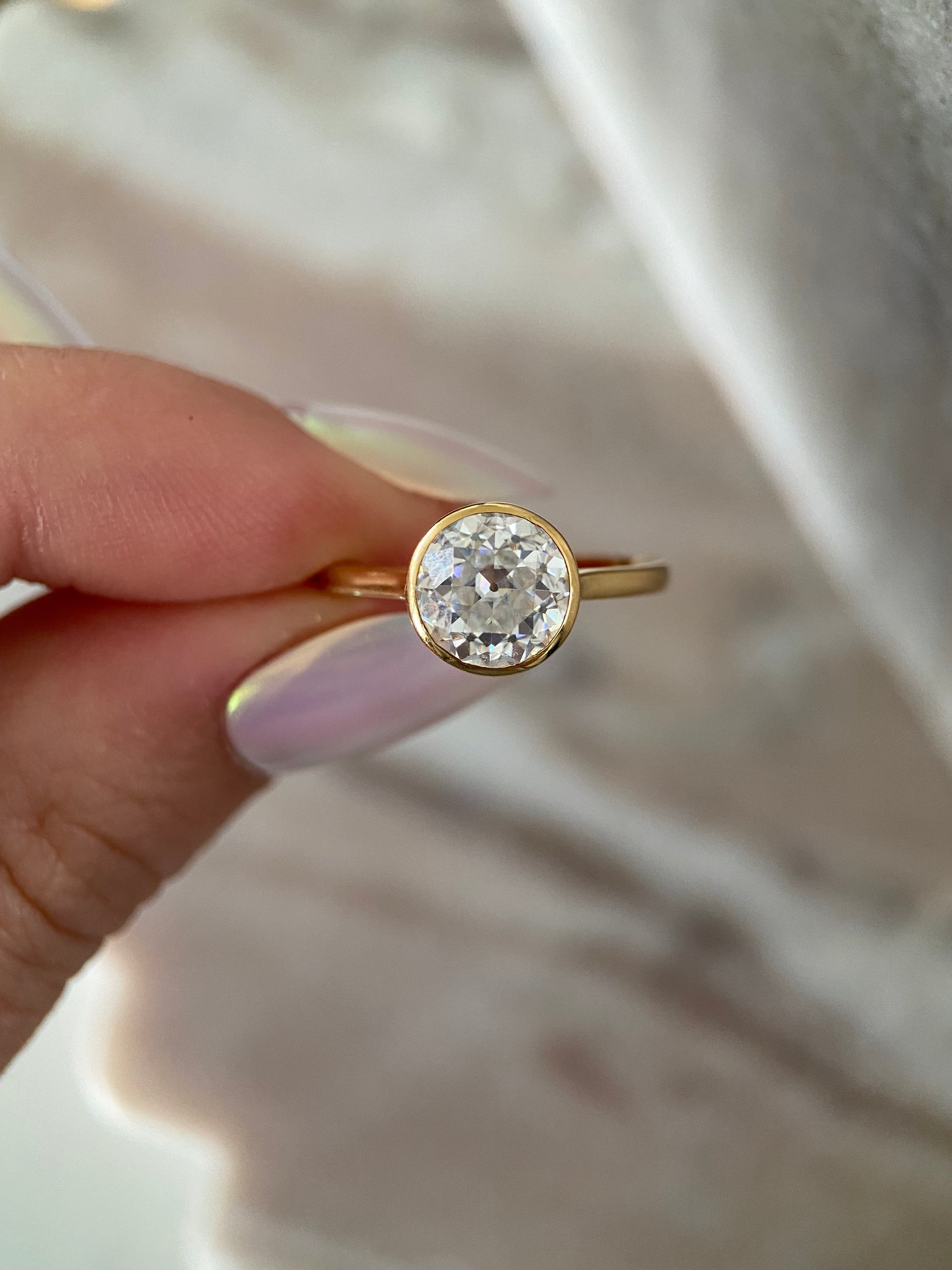 Bangin' Bezel - OEC Edition features a 7.5mm Old European Cut moissanite or lab diamond in a solid gold bezel setting.