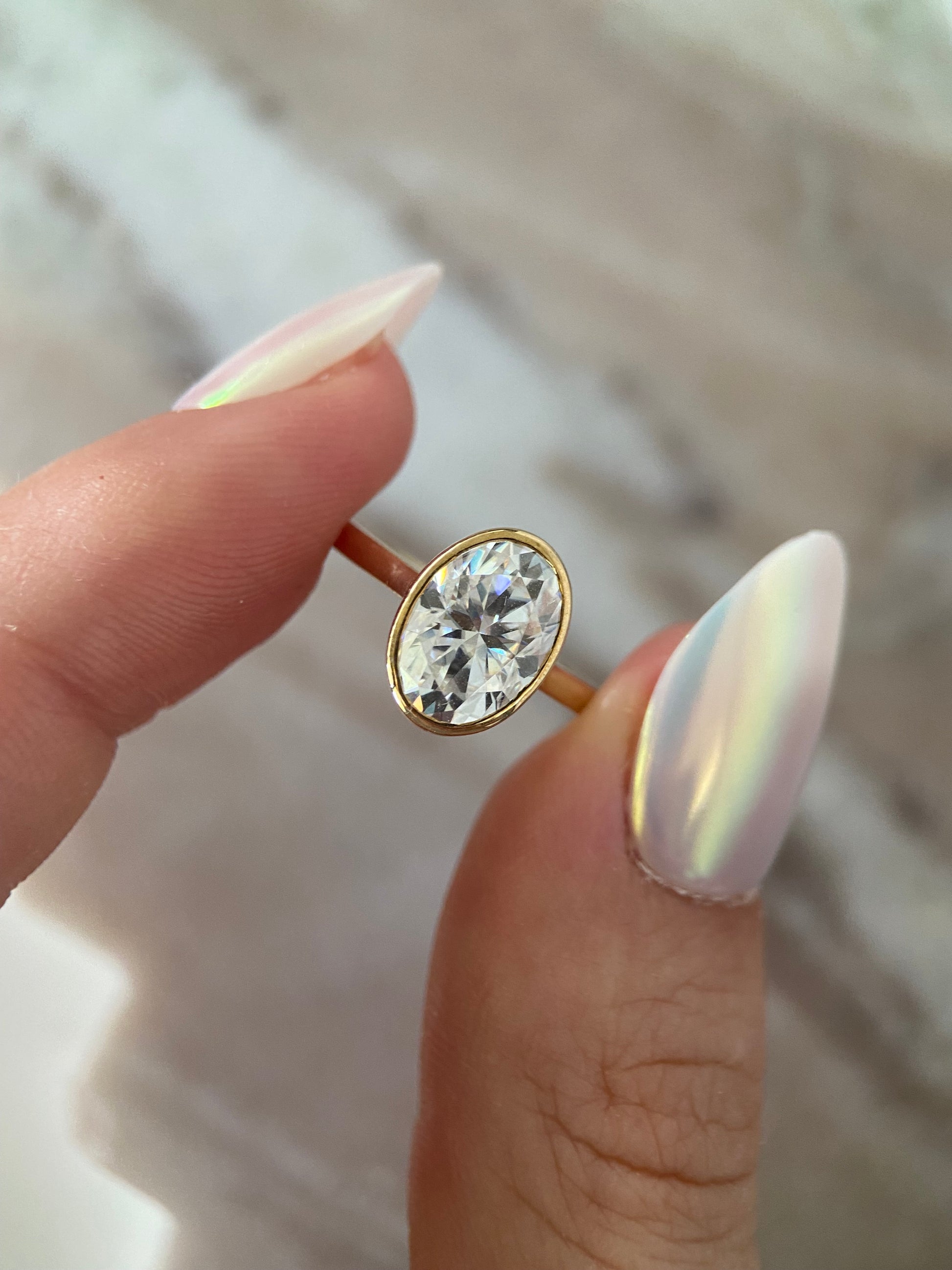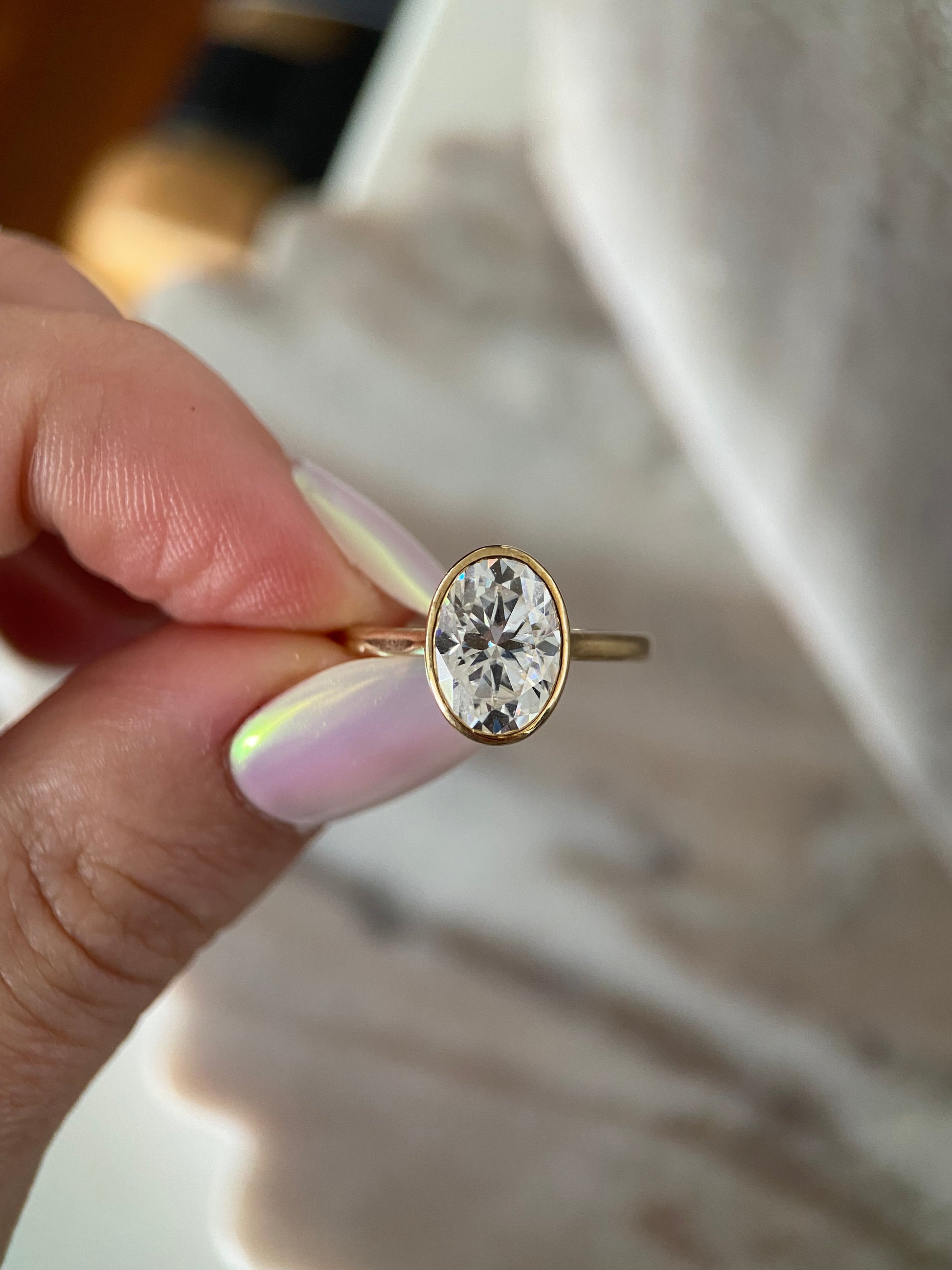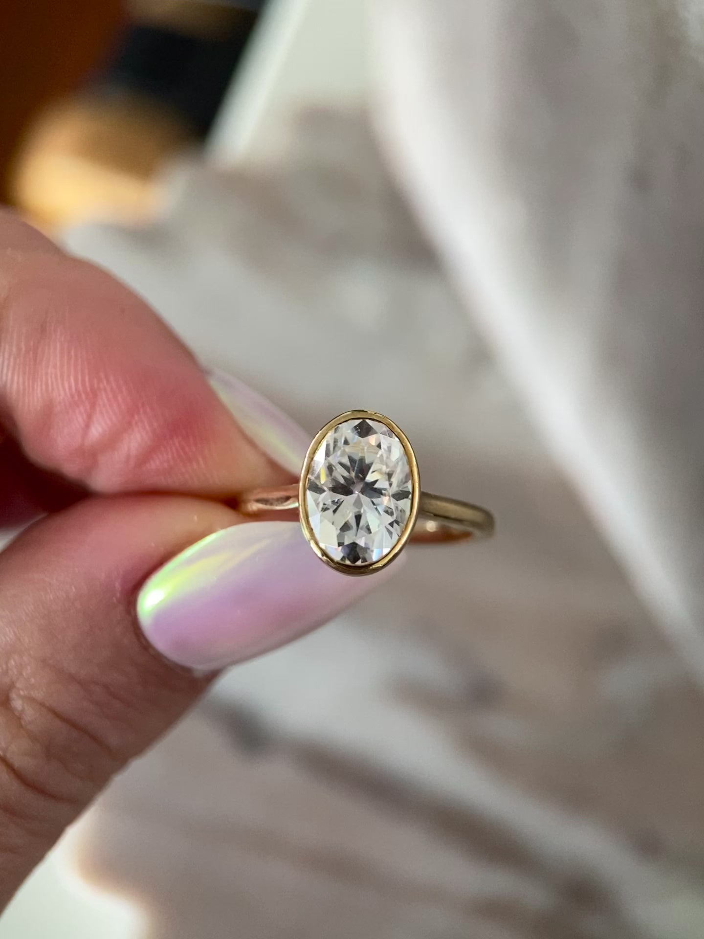 Bangin' Bezel - Oval Edition features a 7x10mm DEF oval moissanite or lab diamond in a solid gold bezel setting.