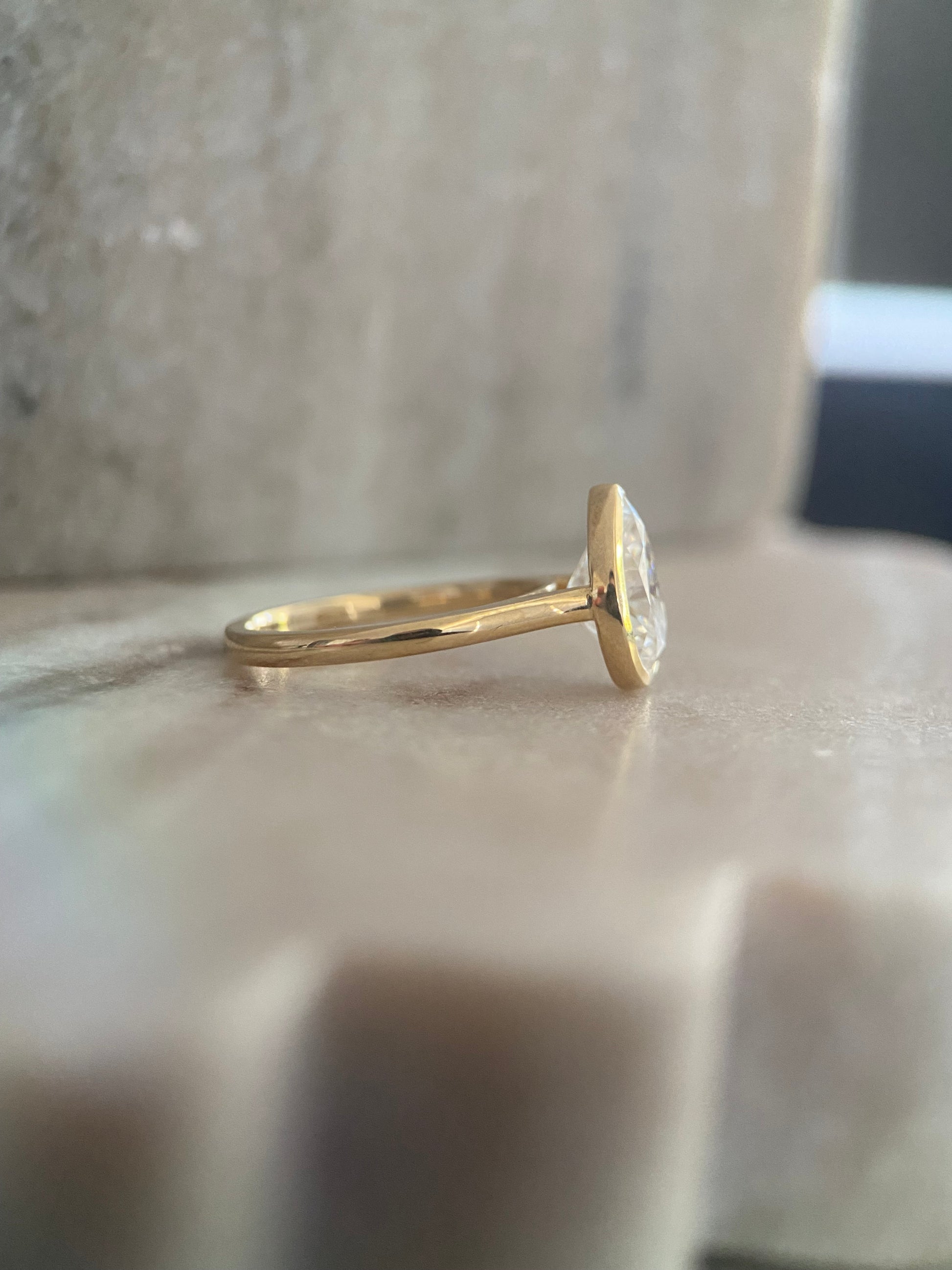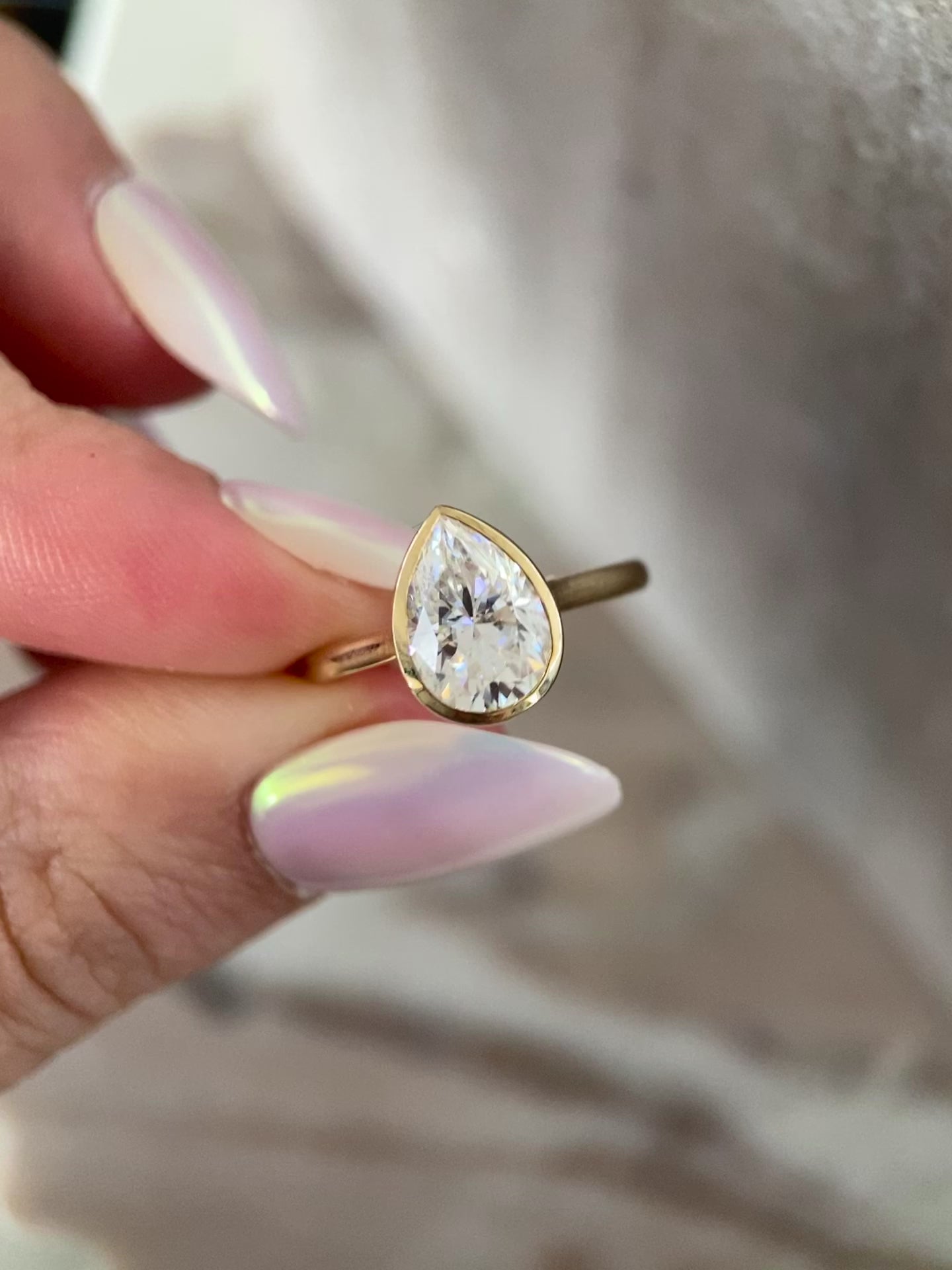 Bangin' Bezel - Pear Edition features a 7x10mm emerald cut moissanite or lab diamond in a solid gold bezel setting.