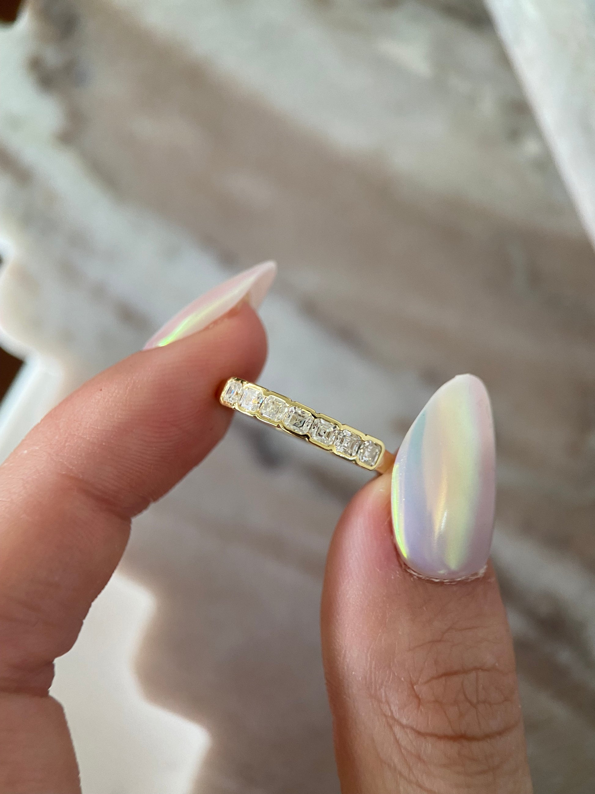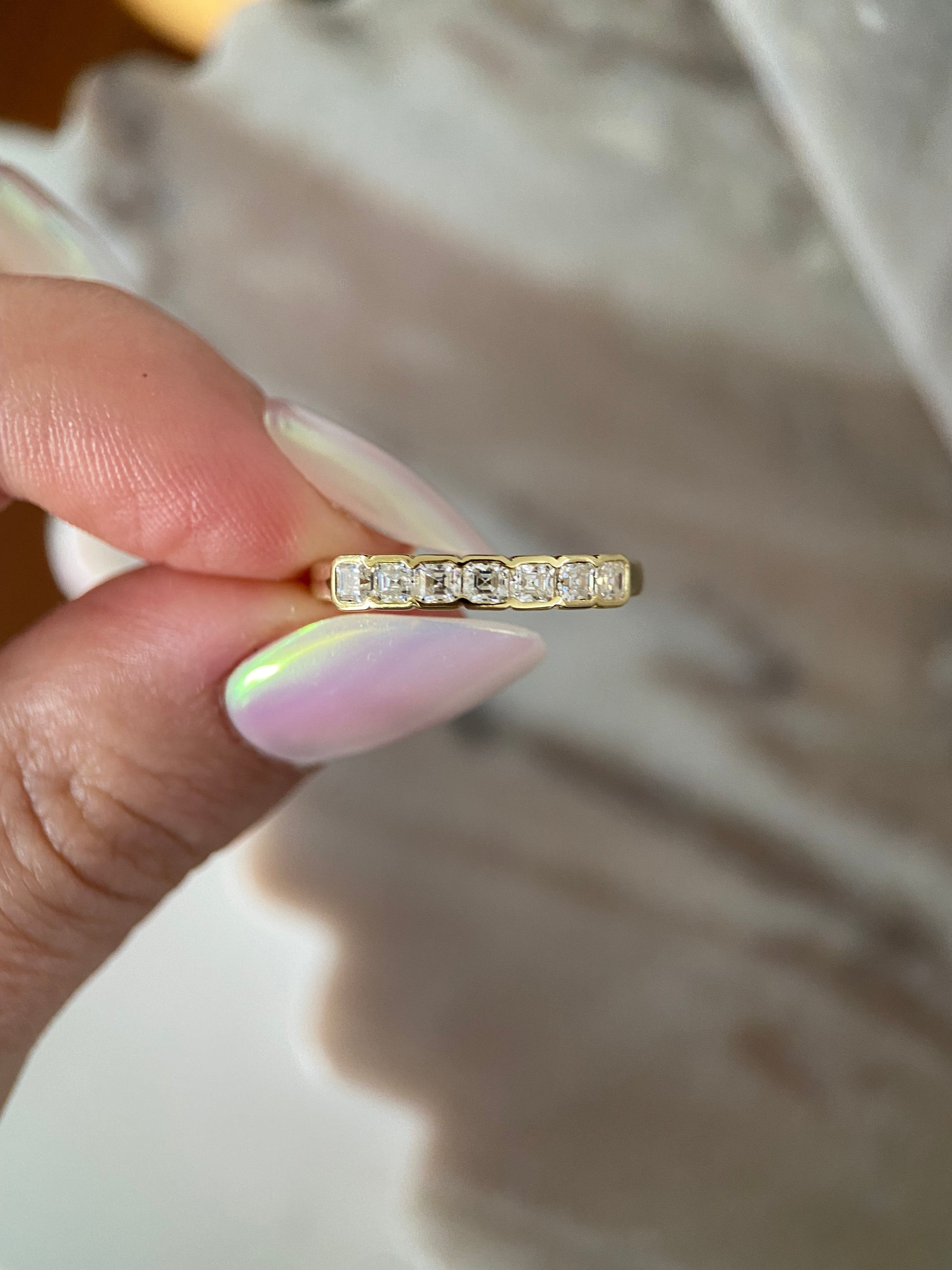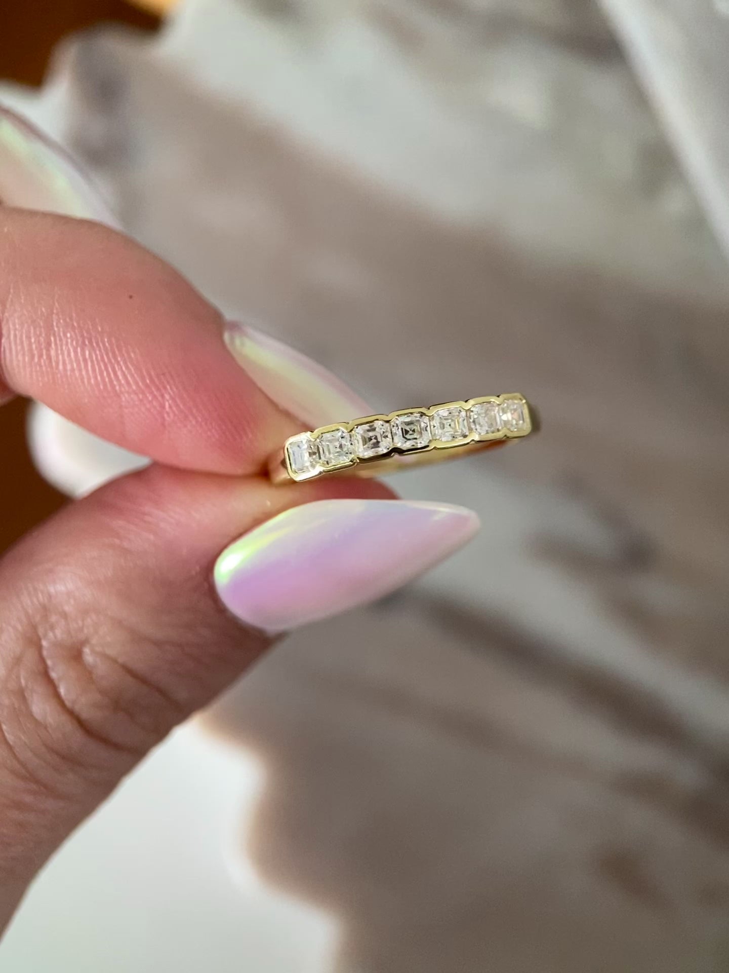 Battle of the Bands - Asscher features 7 x 2.5mm DEF asscher cut moissanites or lab diamonds in a solid gold setting.