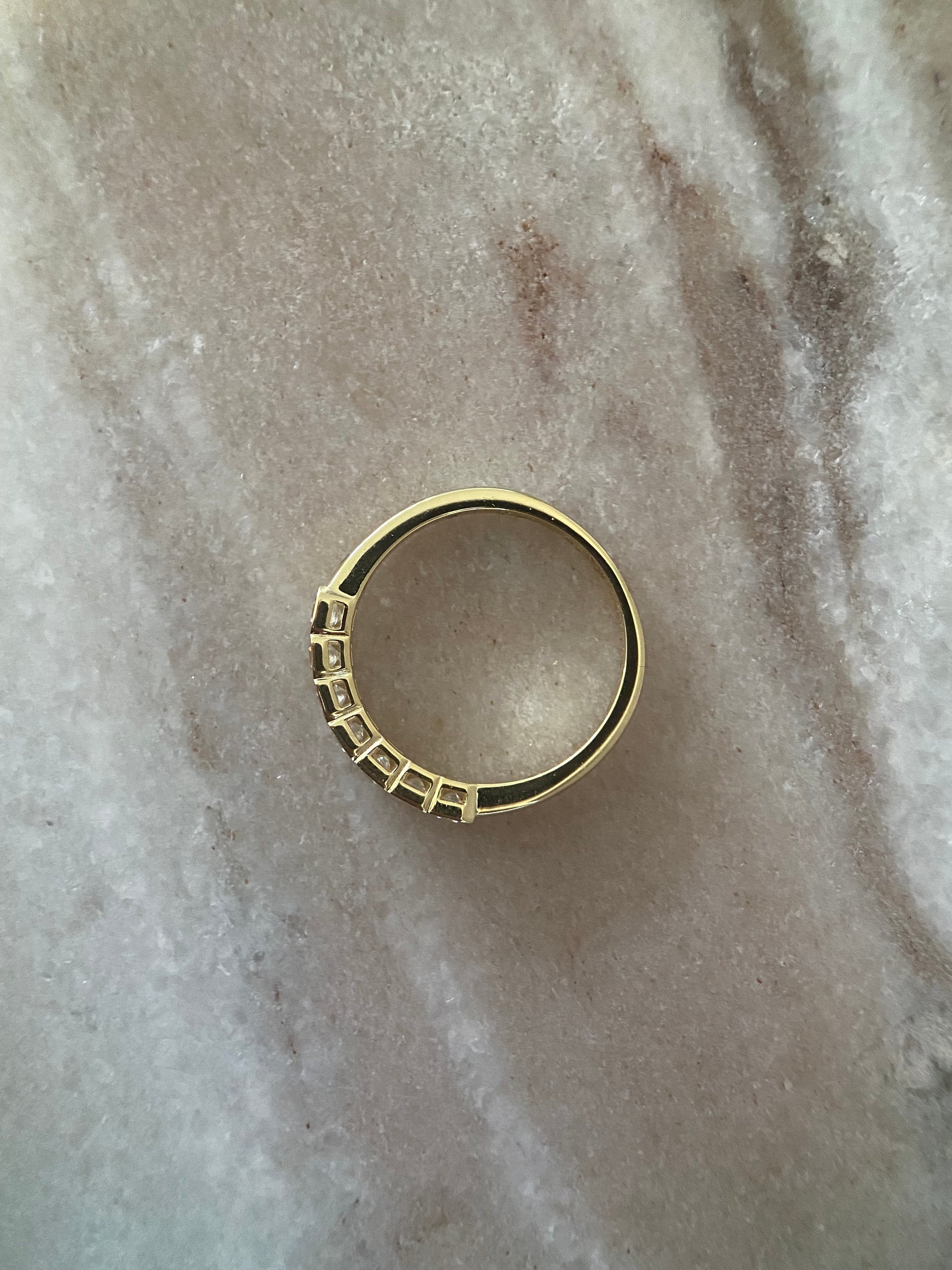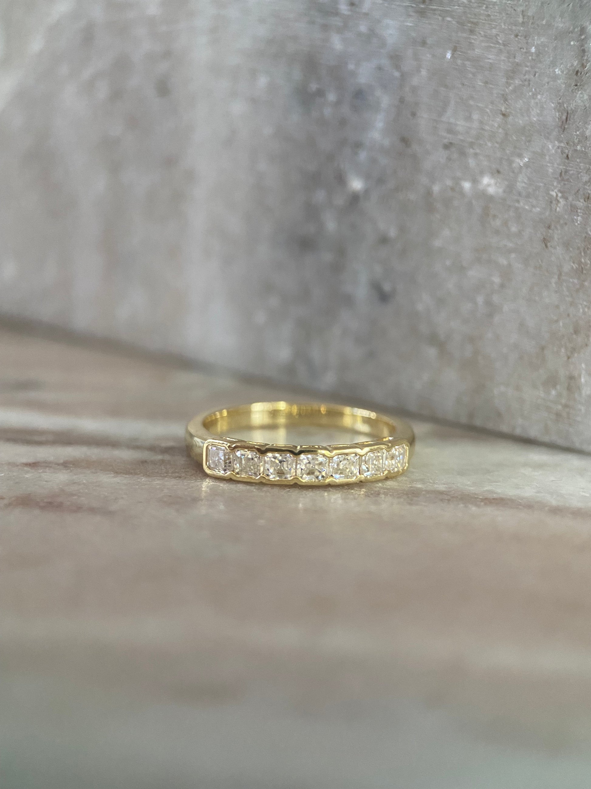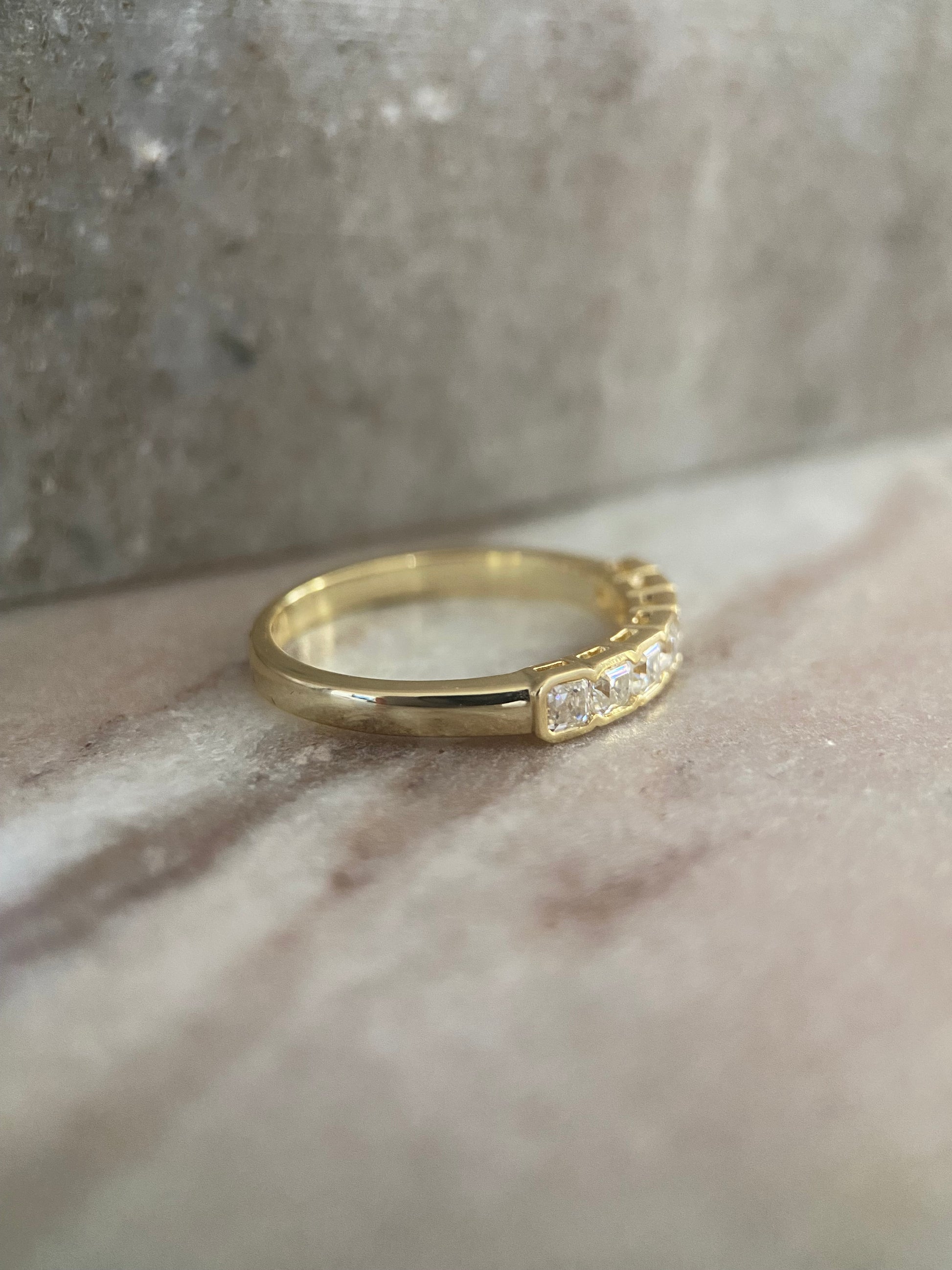 Battle of the Bands - Asscher features 7 x 2.5mm DEF asscher cut moissanites or lab diamonds in a solid gold setting.