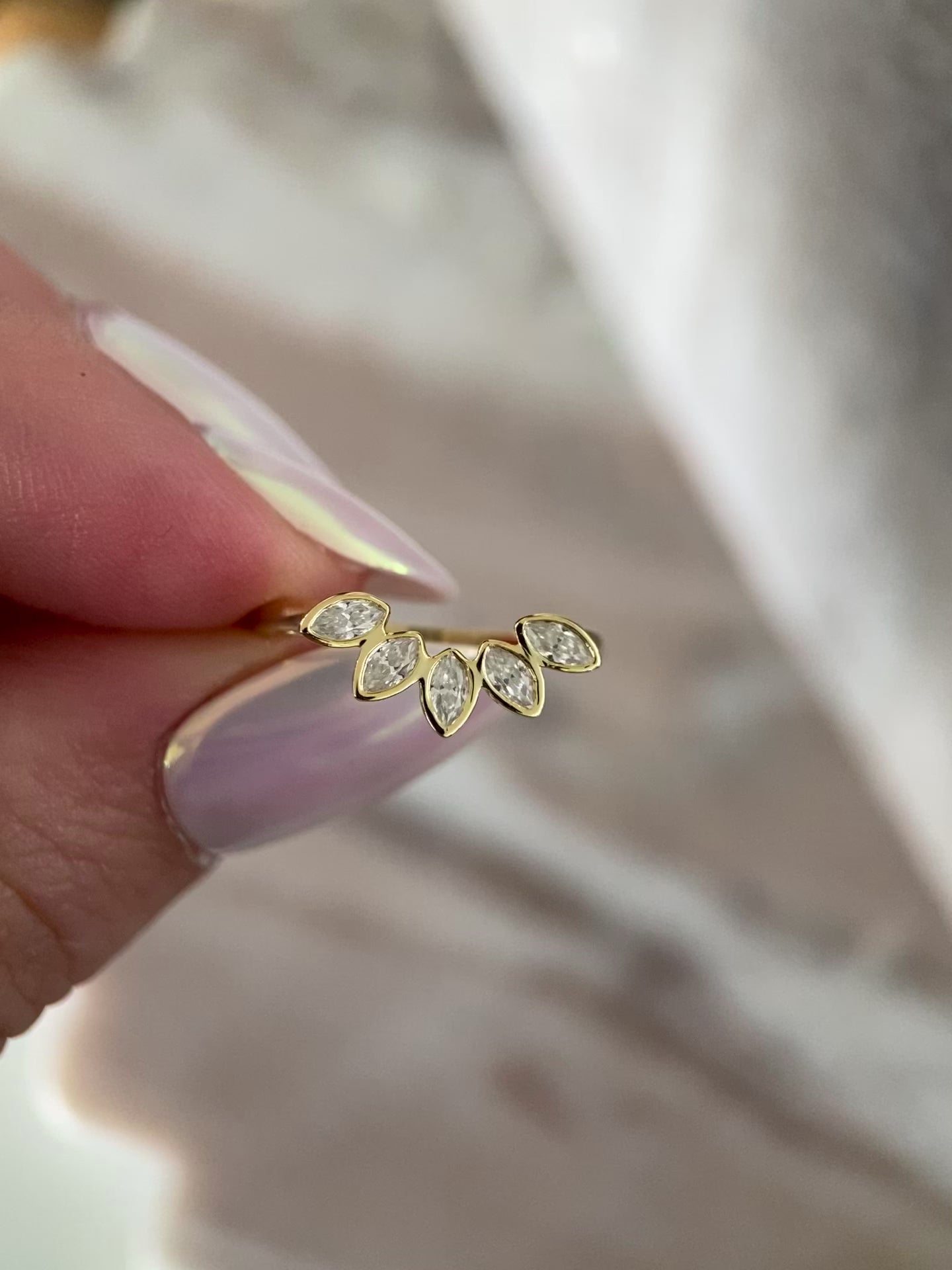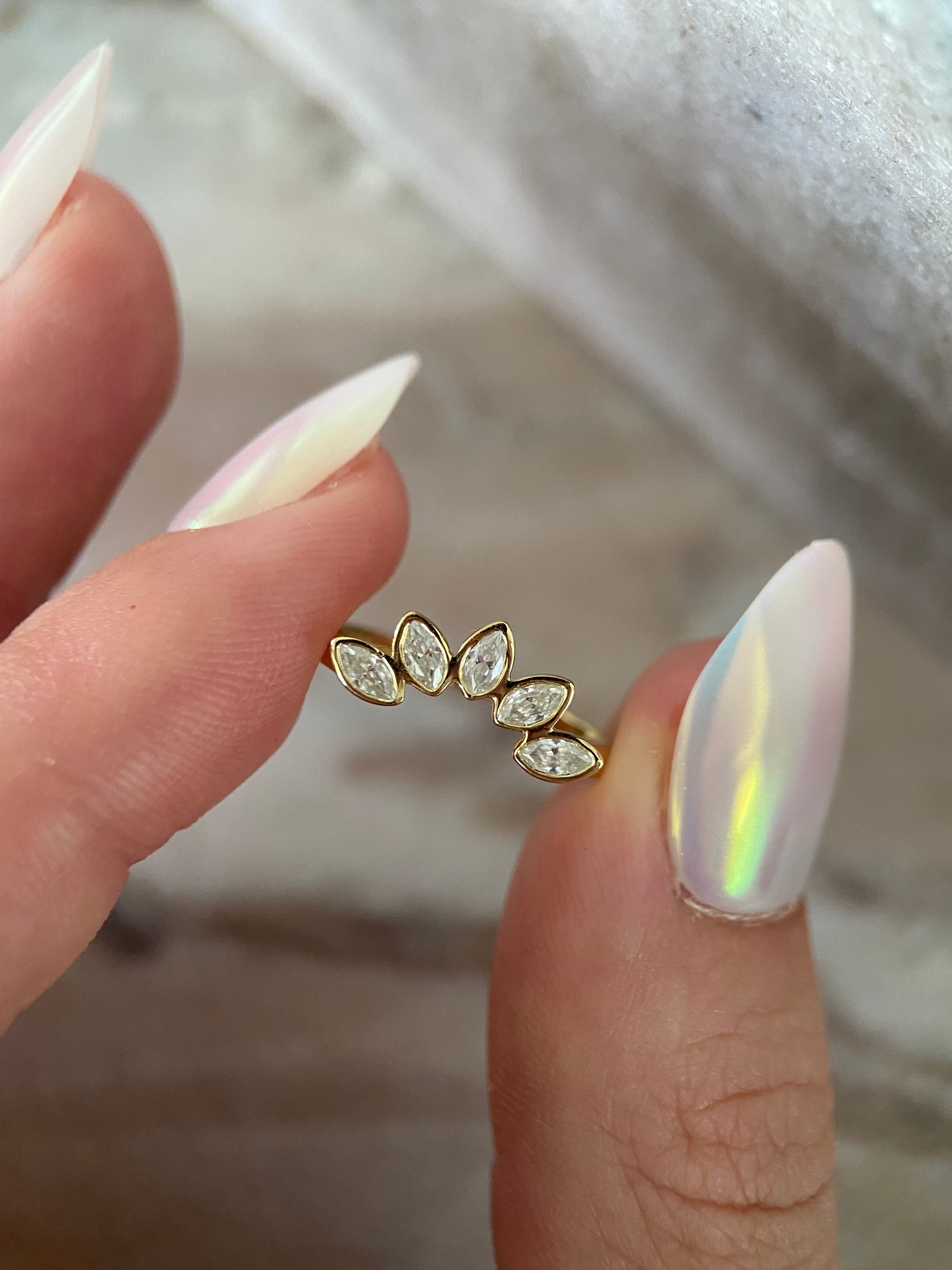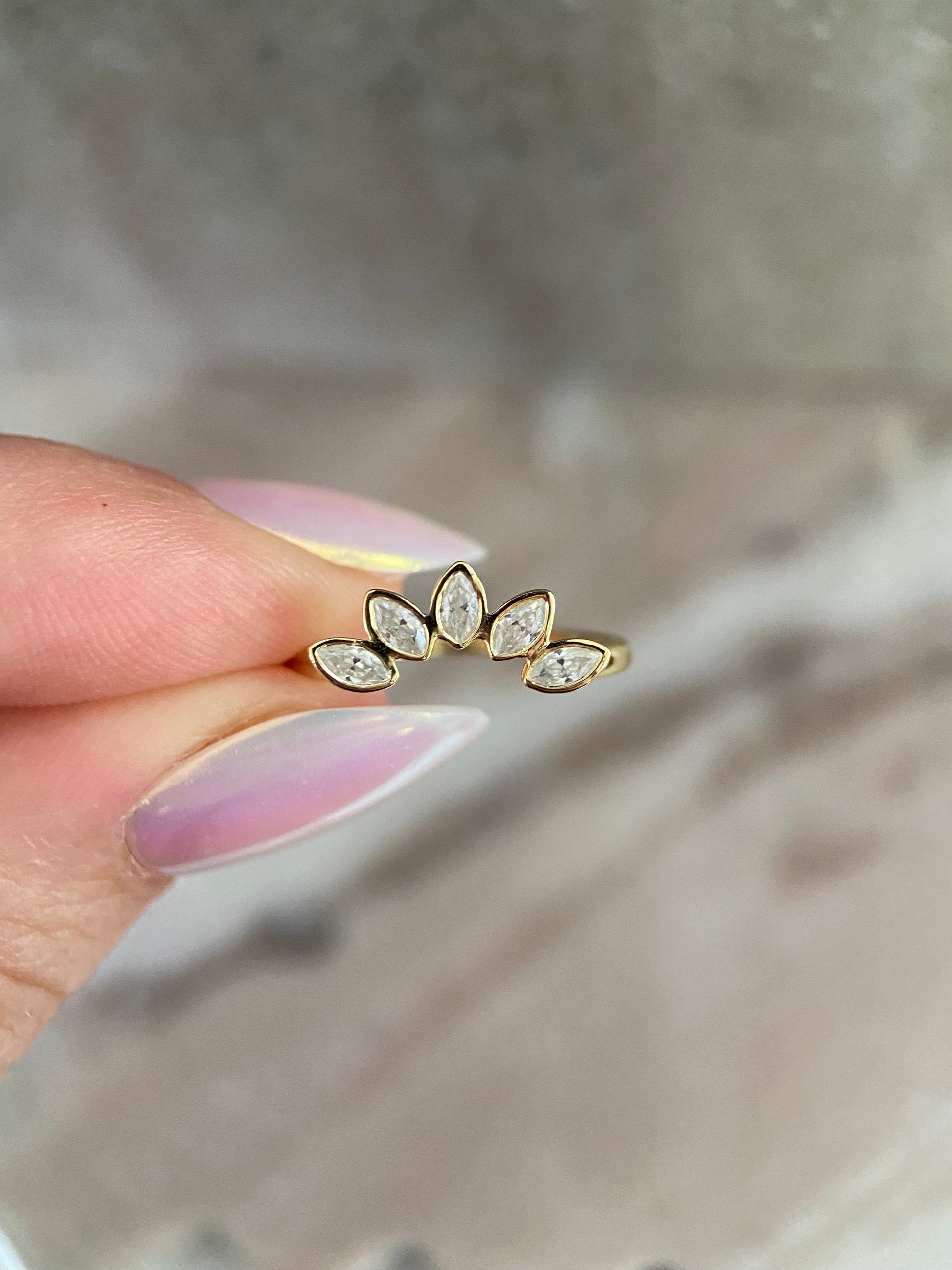 Battle of the Bands - Crown is the perfect pairing to any solitaire ring. Battle of the Bands - Crown features 5 x 2x4mm DEF marquise moissanites or lab diamonds in a solid gold setting.