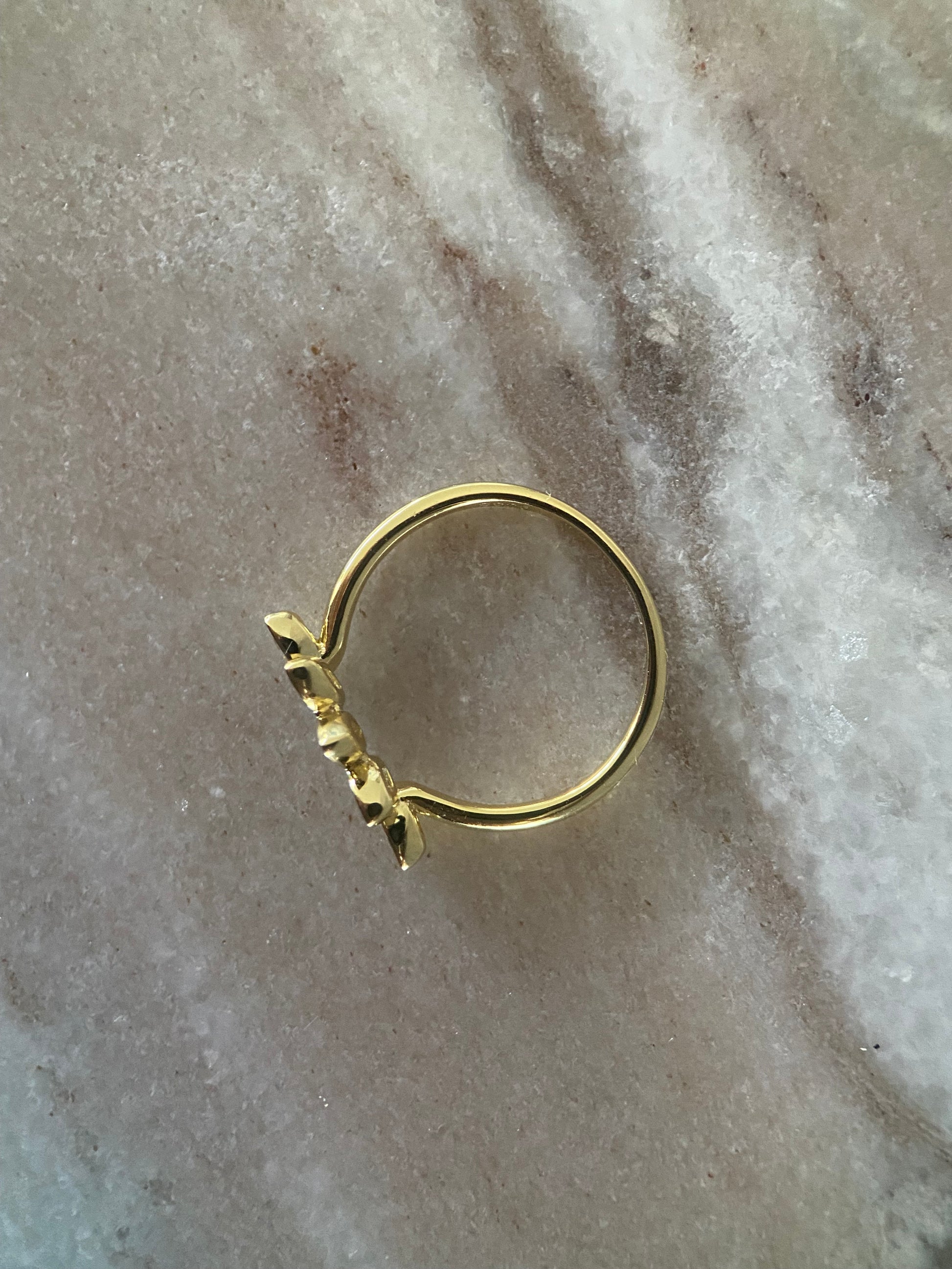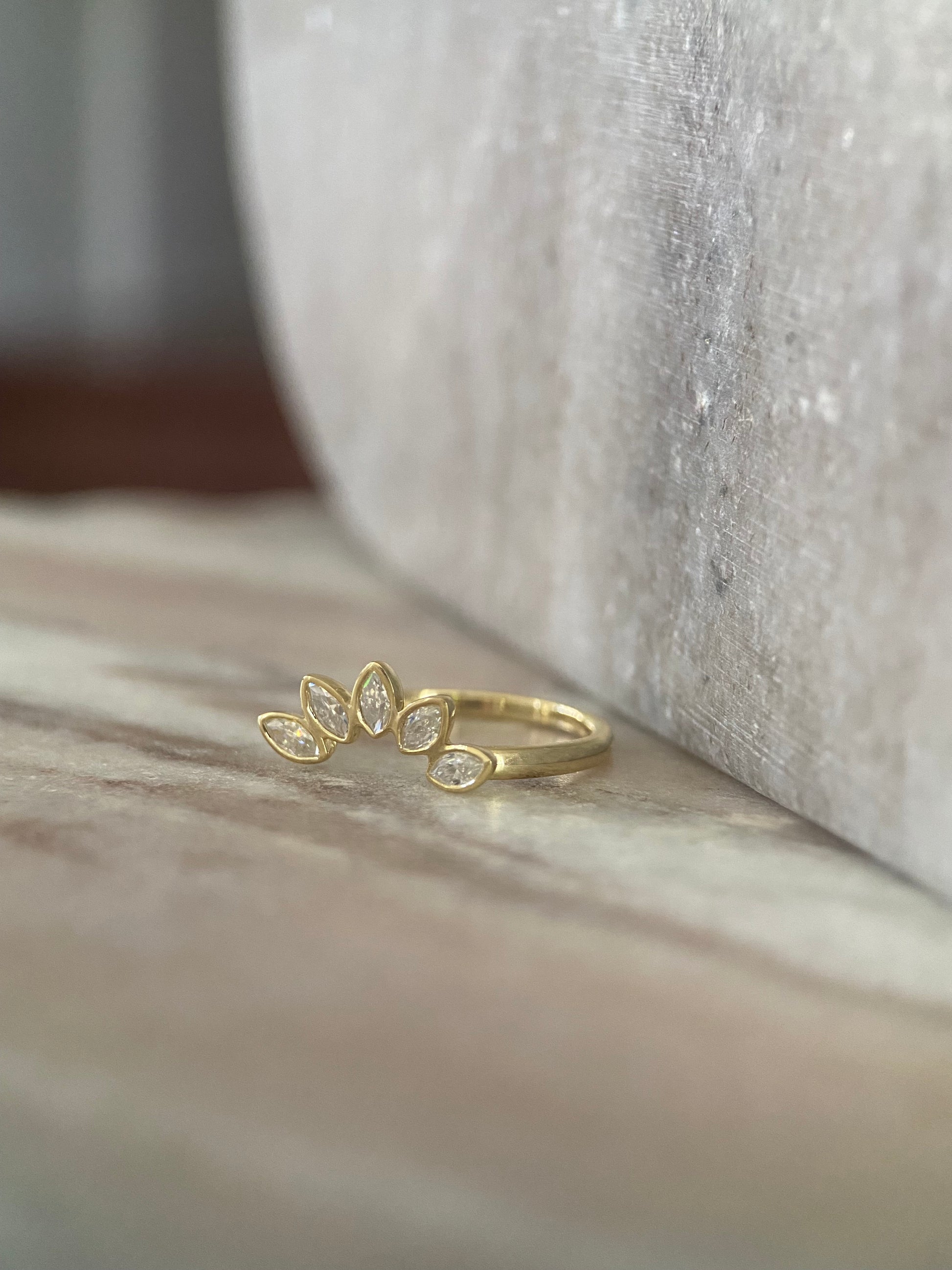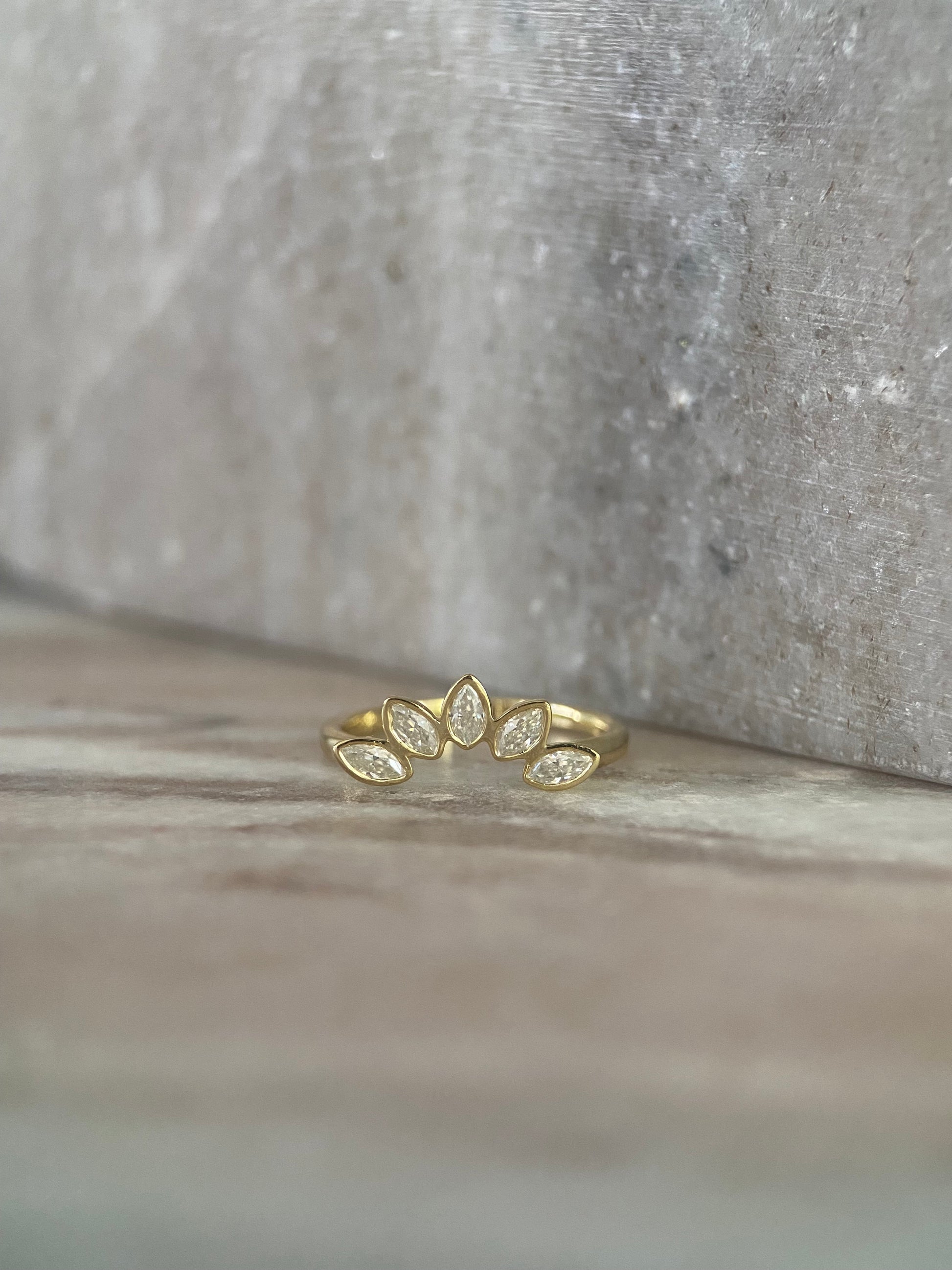 Battle of the Bands - Crown is the perfect pairing to any solitaire ring. Battle of the Bands - Crown features 5 x 2x4mm DEF marquise moissanites or lab diamonds in a solid gold setting.
