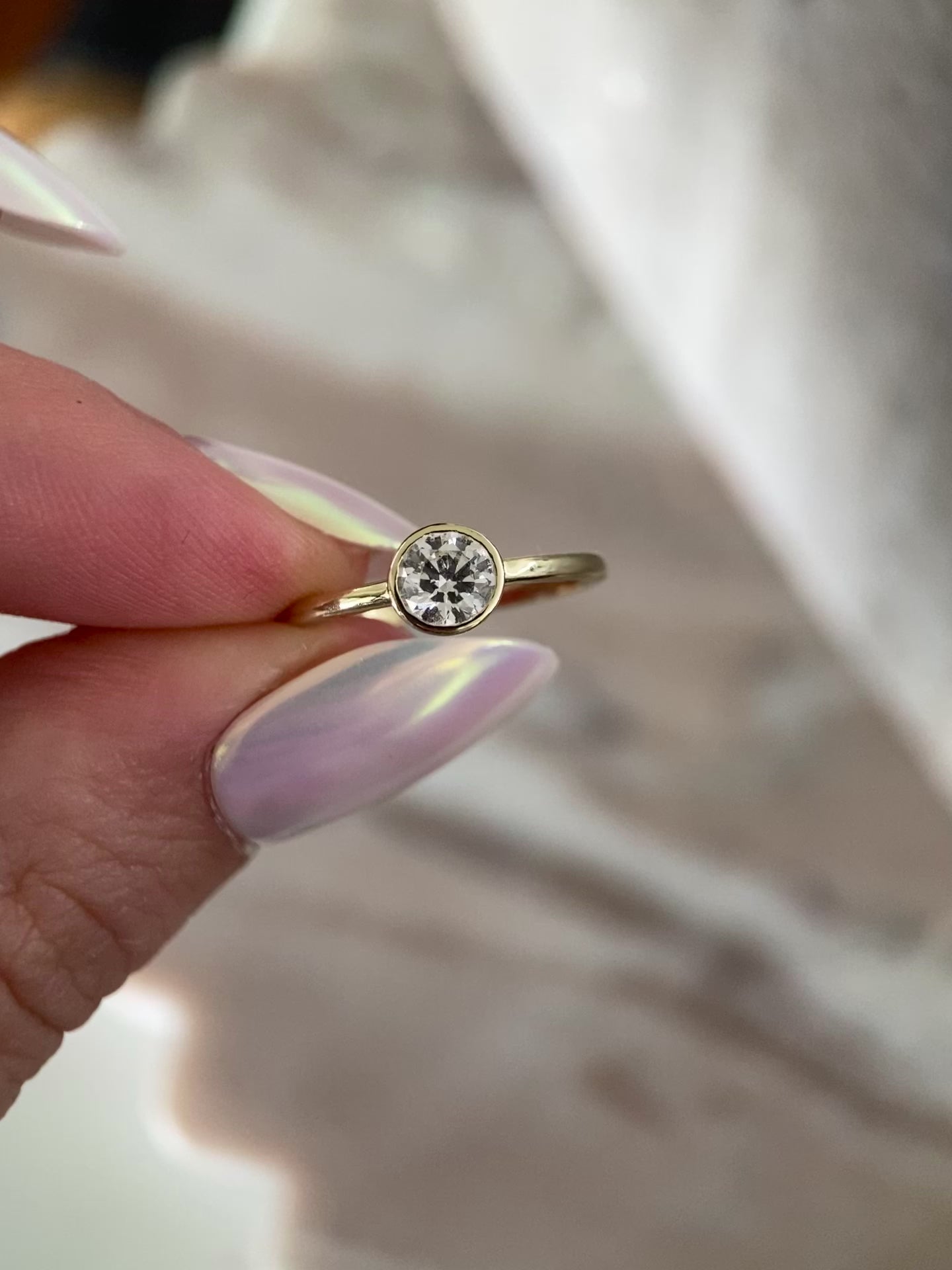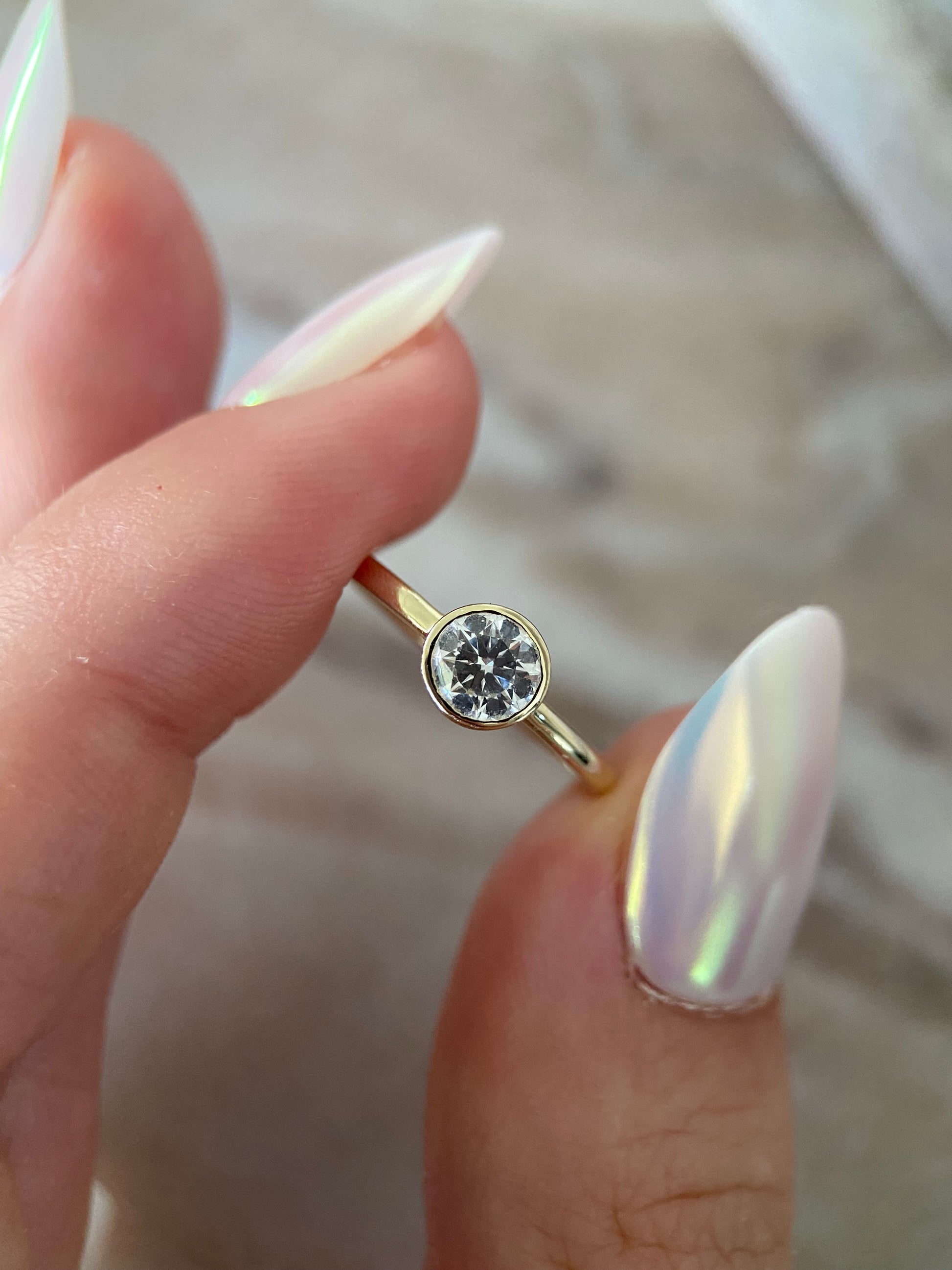 Stones: 5mm round cut DEF lab diamond (0.5 carat diamond equivalent) in a bezel setting.