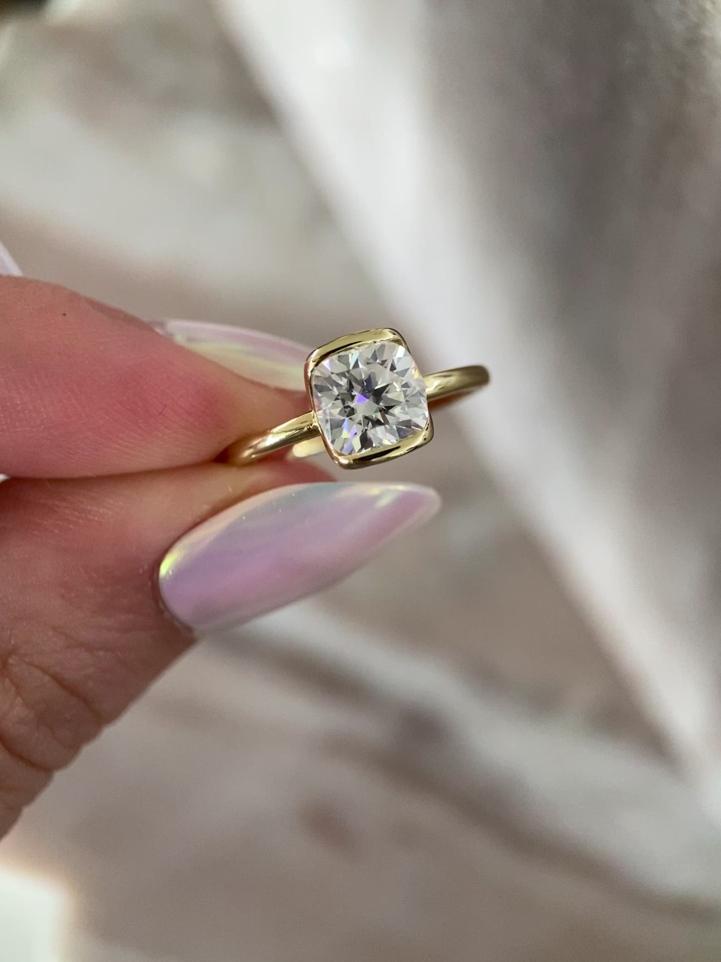 Meet Me Halfway - Cushion Cut Edition features a 7x7mm cushion cut moissanite or lab diamond in a solid gold partial bezel setting.