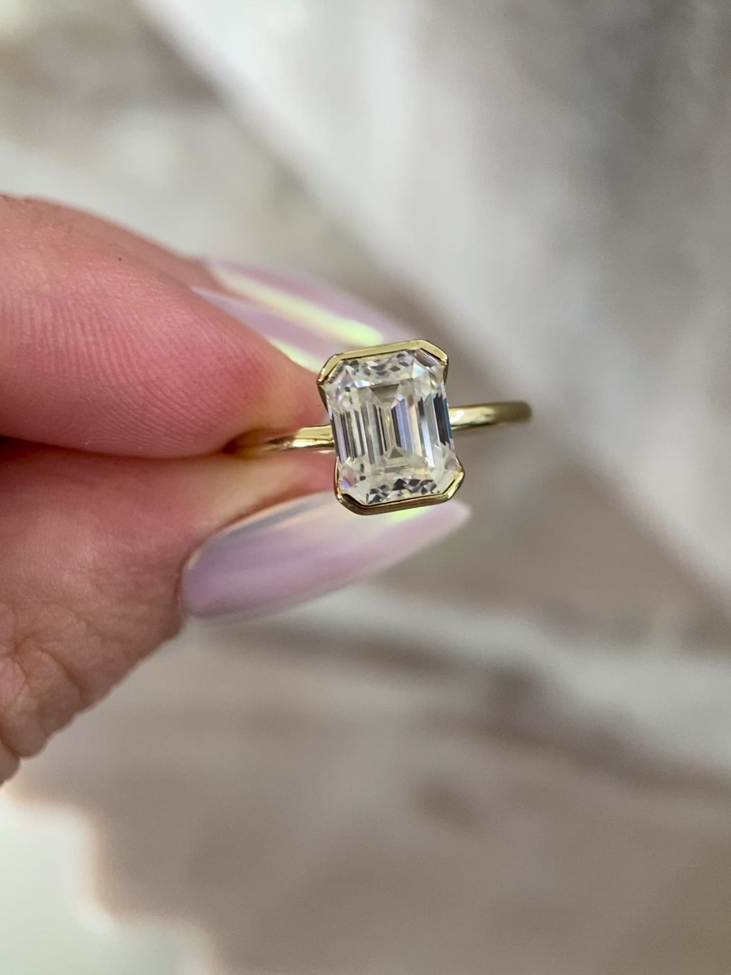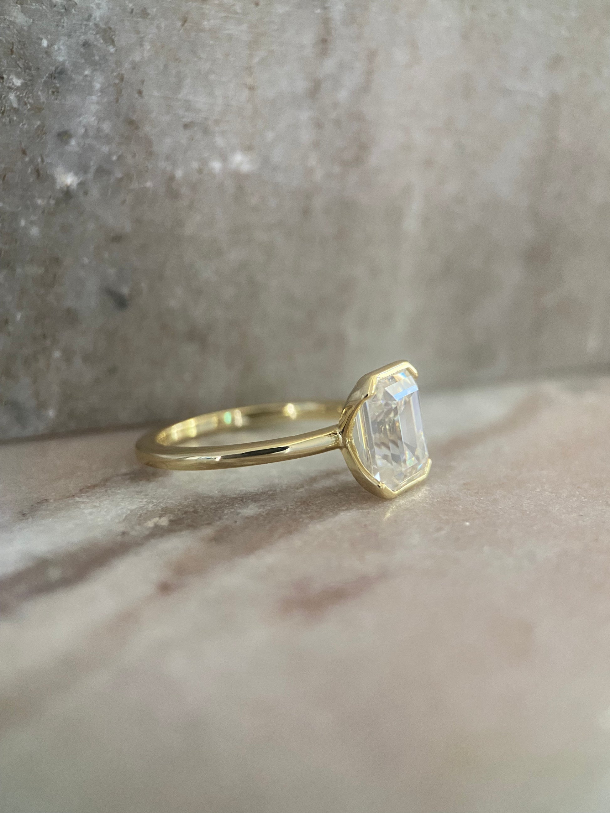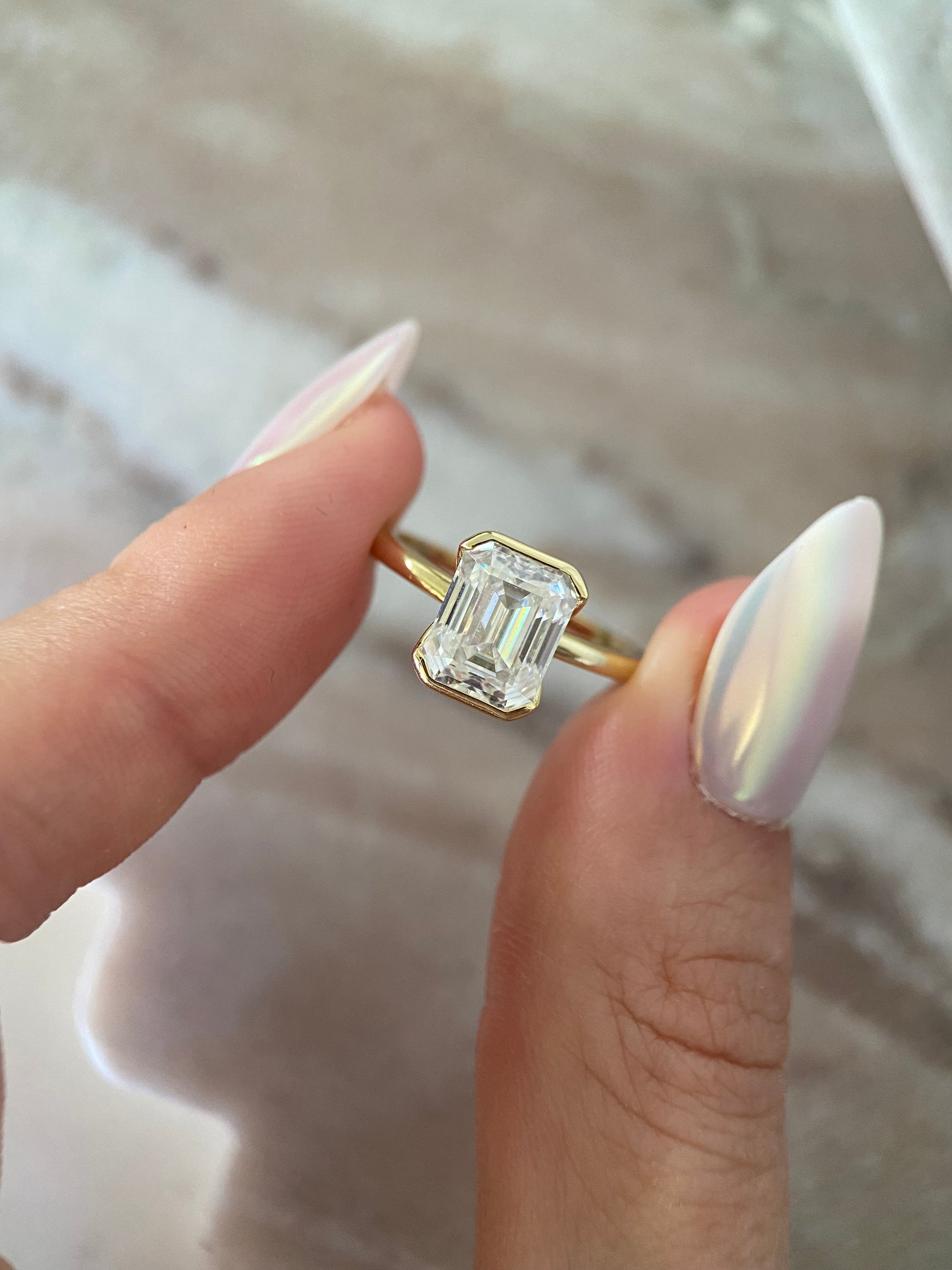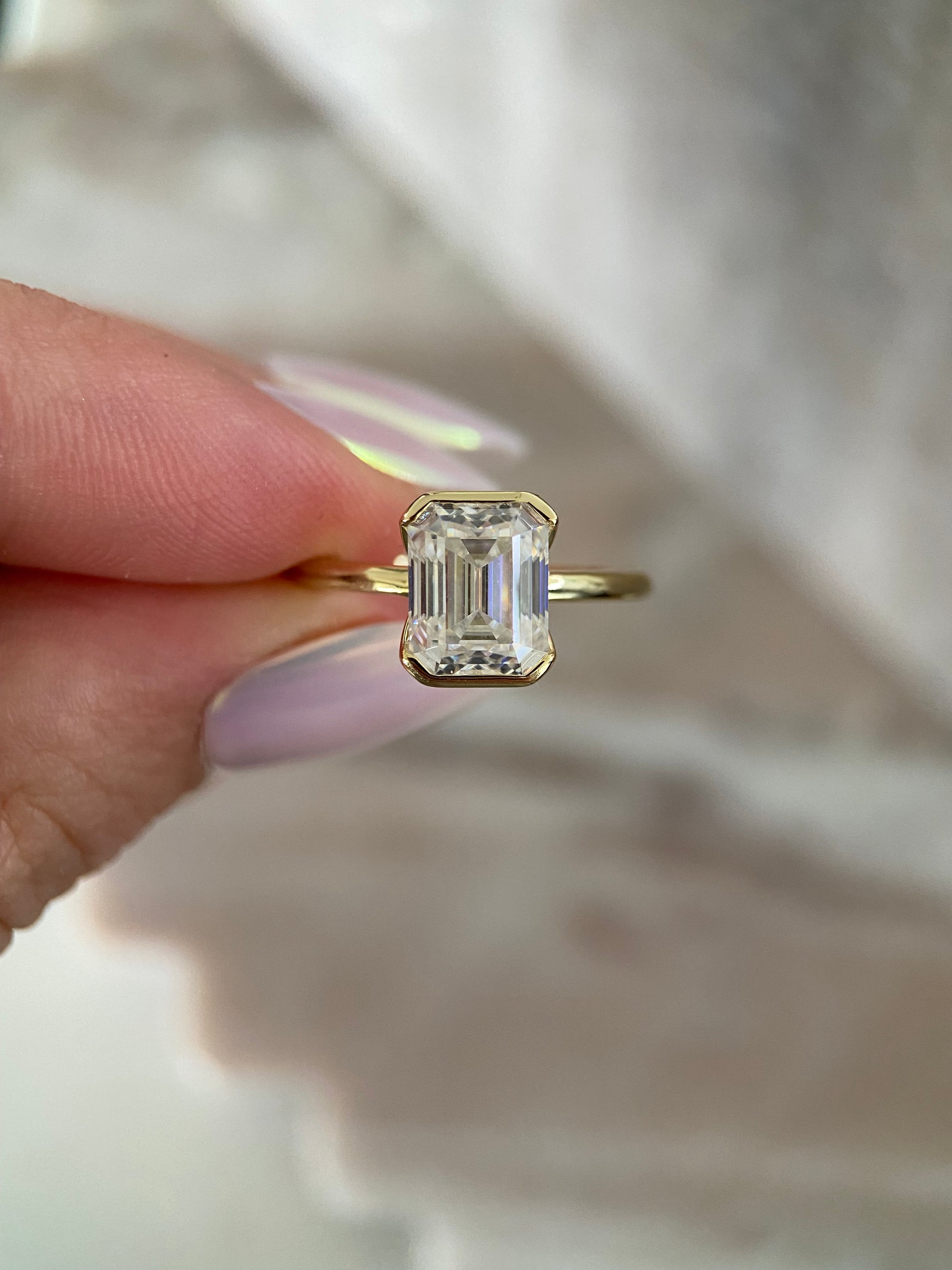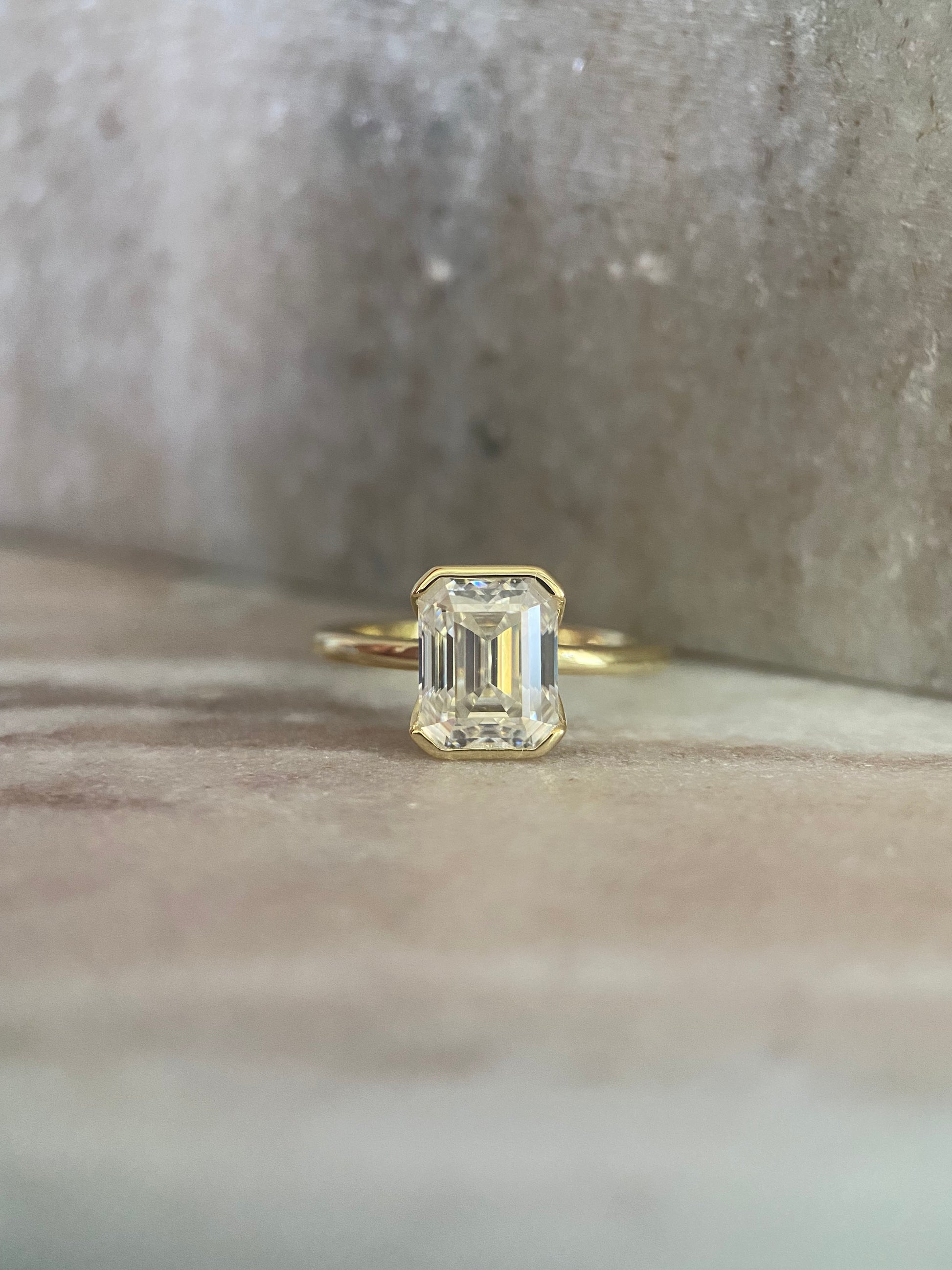 Meet Me Halfway - Emerald Edition features a 7x9mm emerald moissanite or lab diamond in a solid gold partial bezel setting.