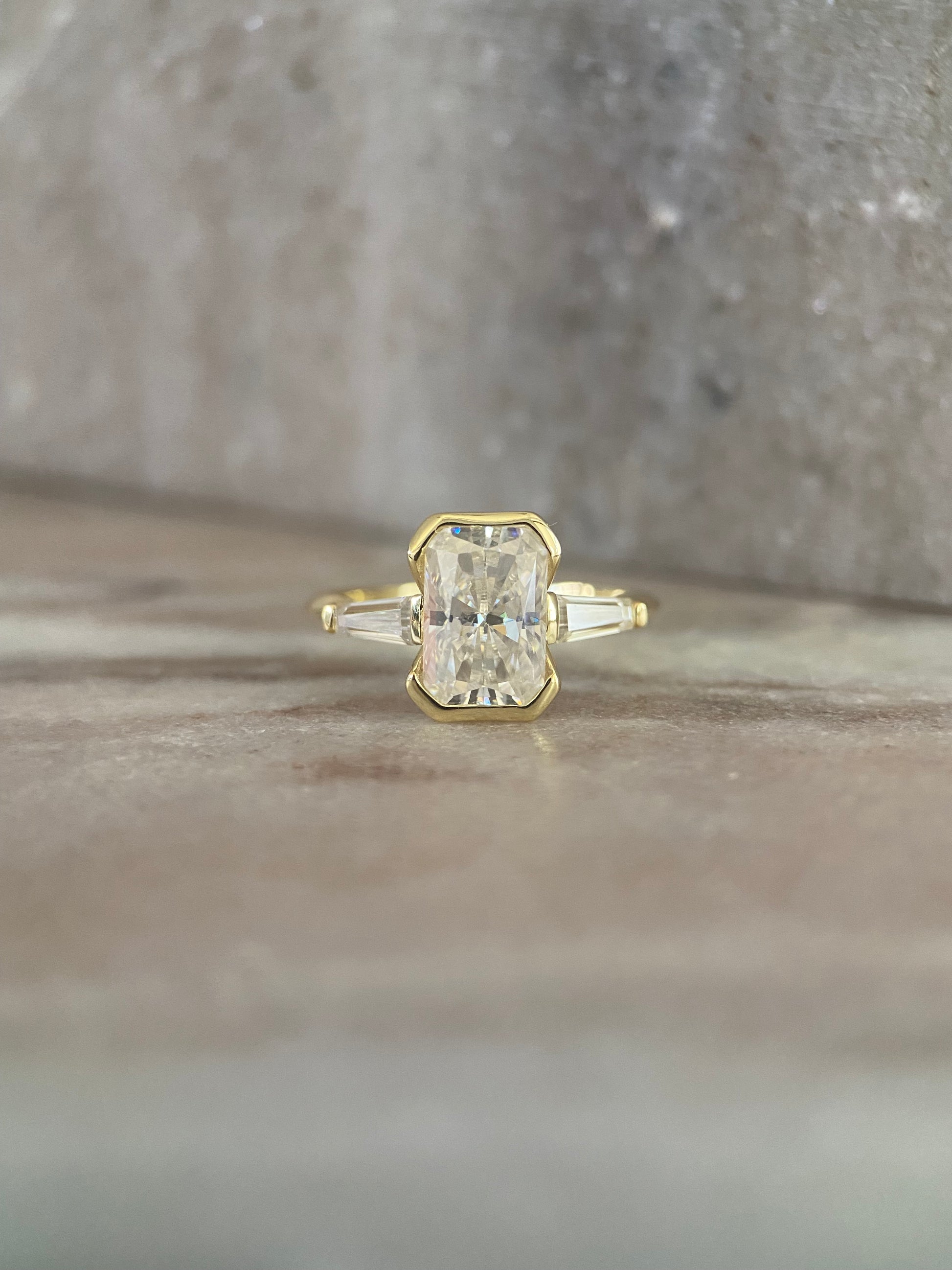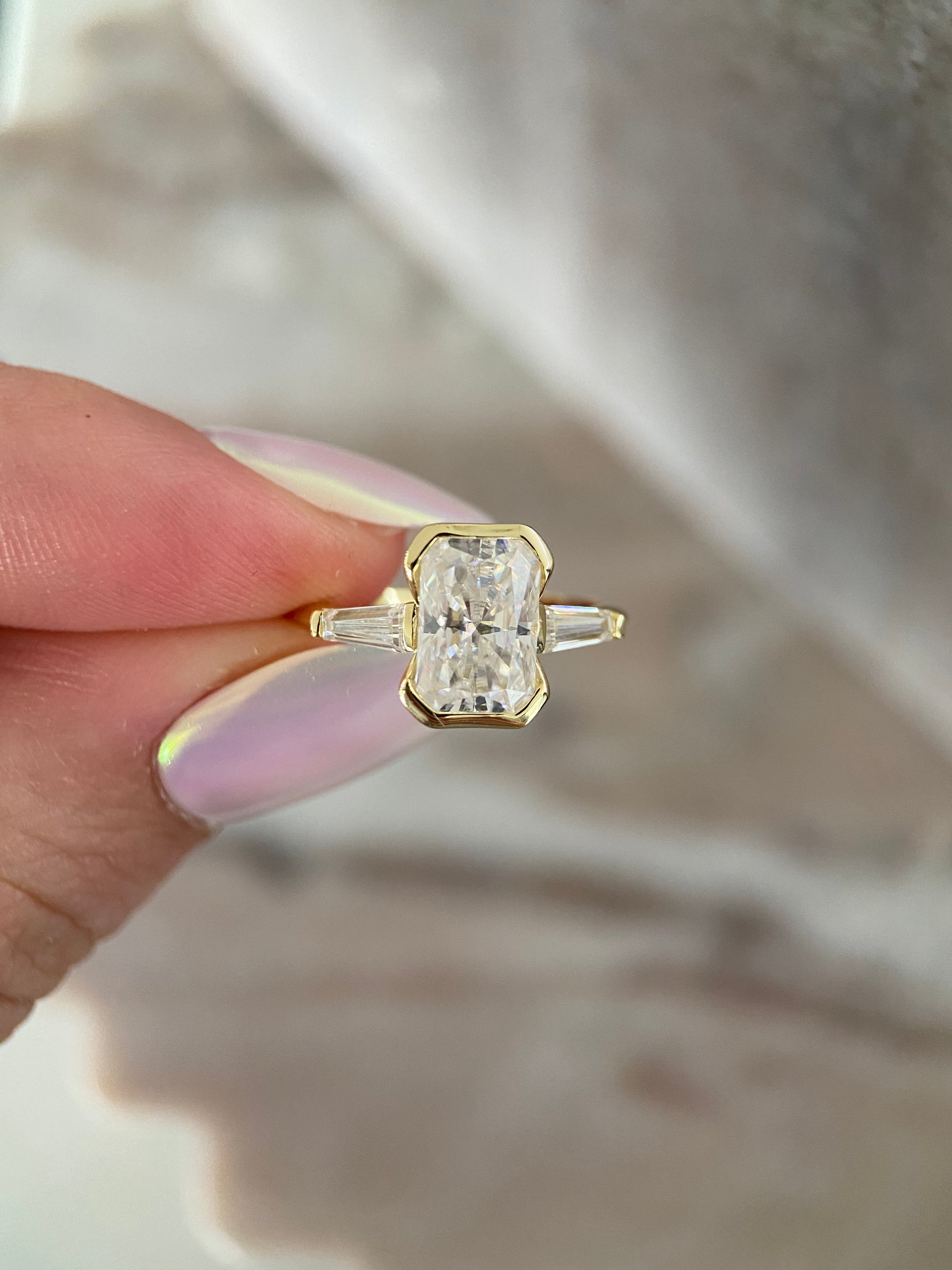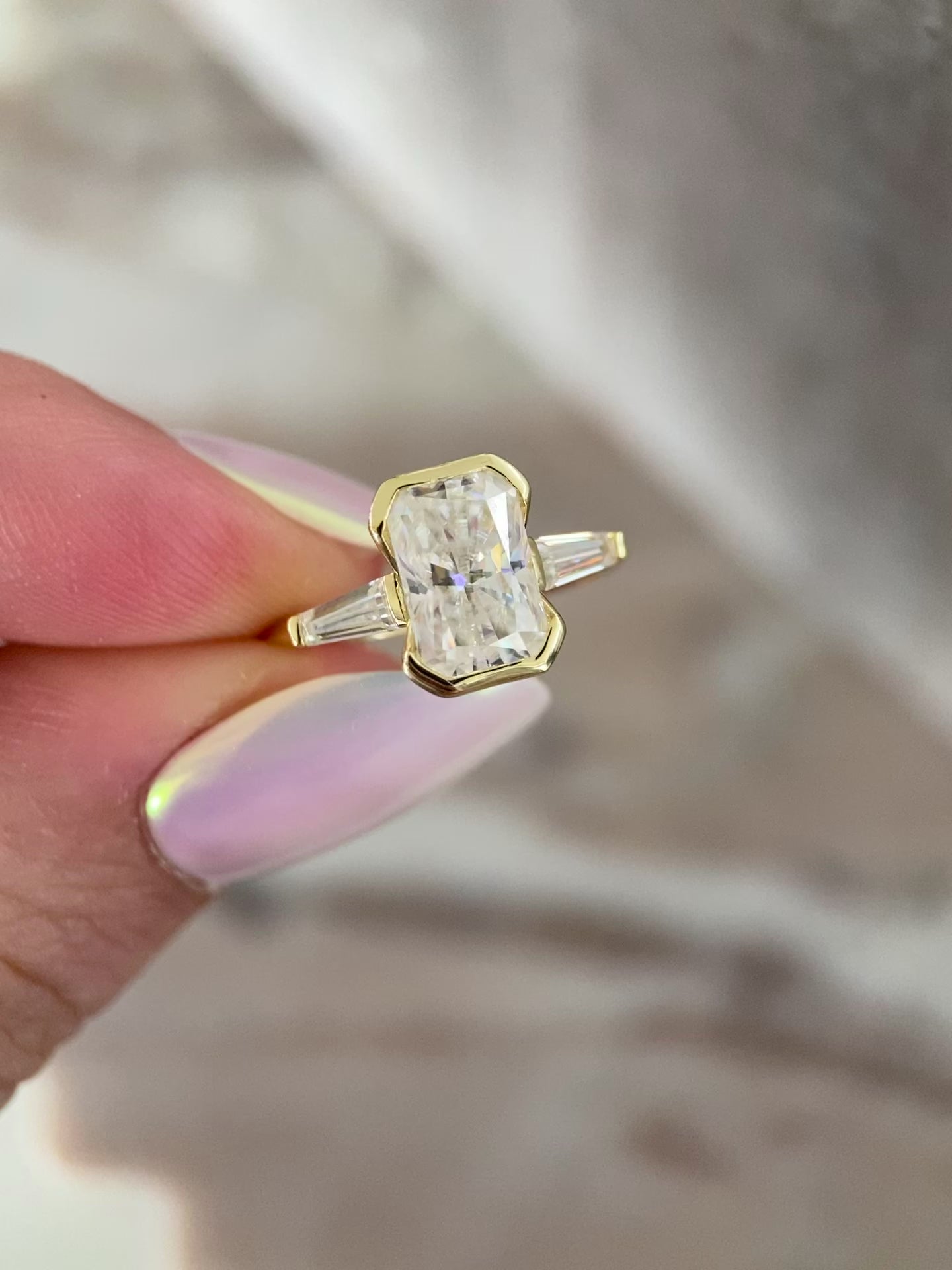 Meet Me Halfway - Radiant Trifecta Edition features a 6x9mm radiant cut moissanite or lab diamond and two 2.5x4mm DEF trapezoid cut moissanites or lab diamonds in a solid gold partial bezel setting.