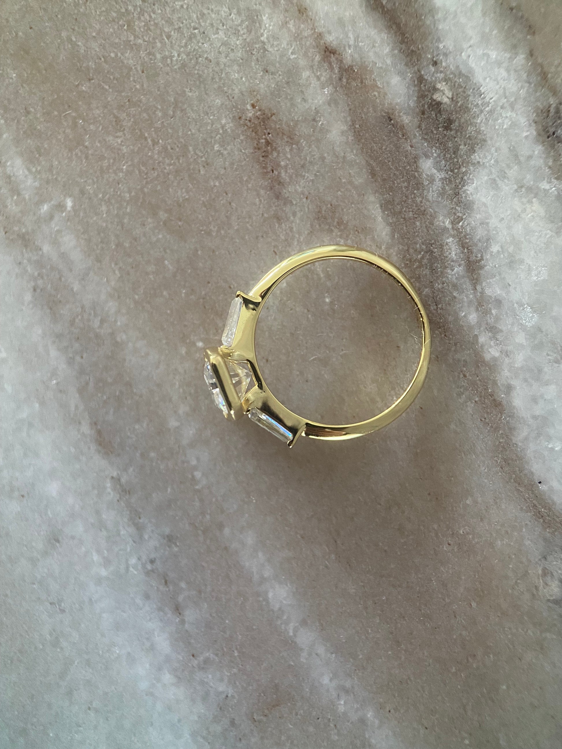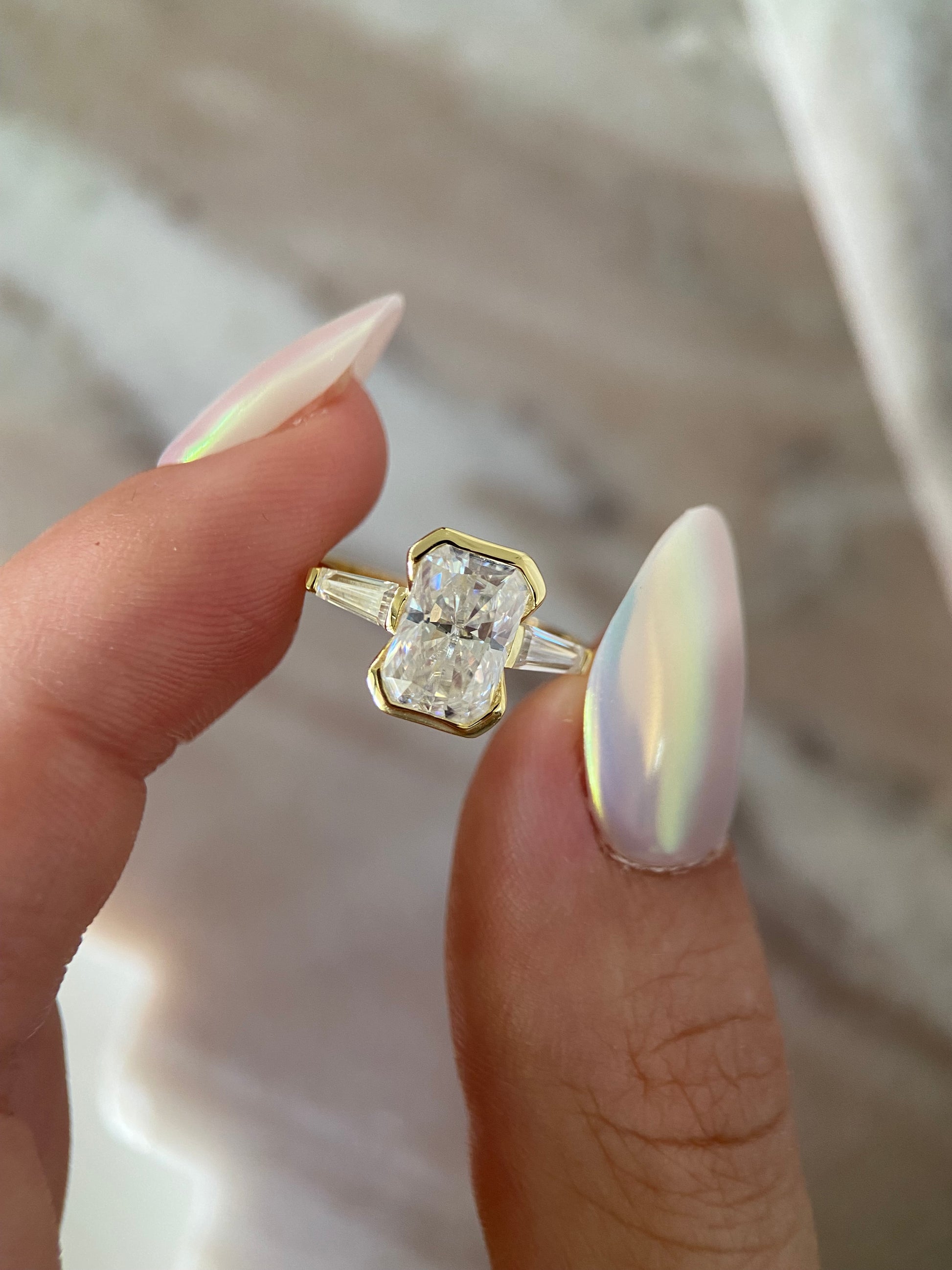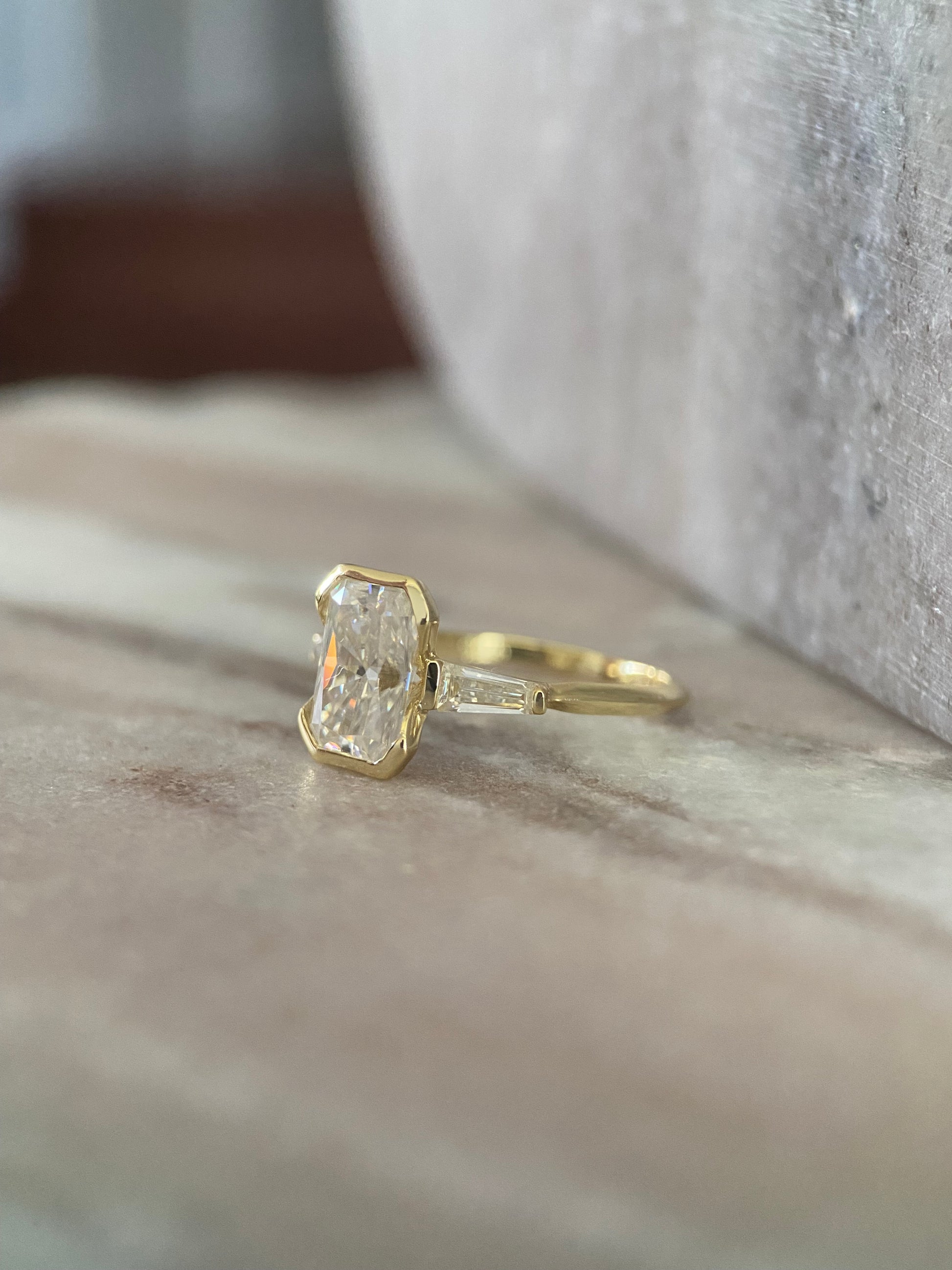 Meet Me Halfway - Radiant Trifecta Edition features a 6x9mm radiant cut moissanite or lab diamond and two 2.5x4mm DEF trapezoid cut moissanites or lab diamonds in a solid gold partial bezel setting.