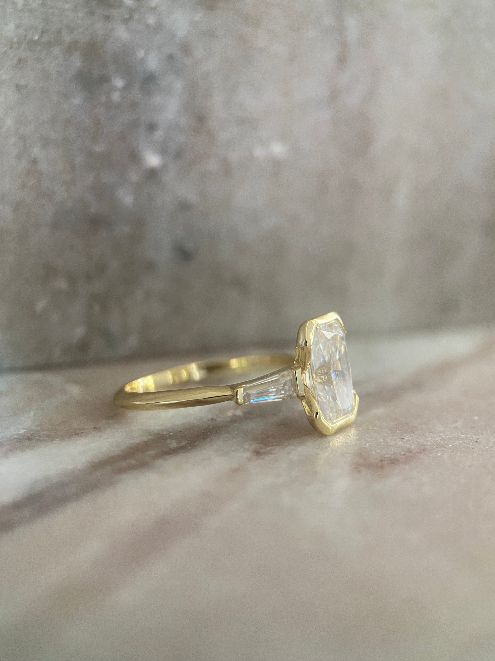 Stones: 6x9mm DEF radiant cut moissanite or lab diamond; 2 x 2.5x4mm DEF trapezoid cut moissanites or lab diamonds.