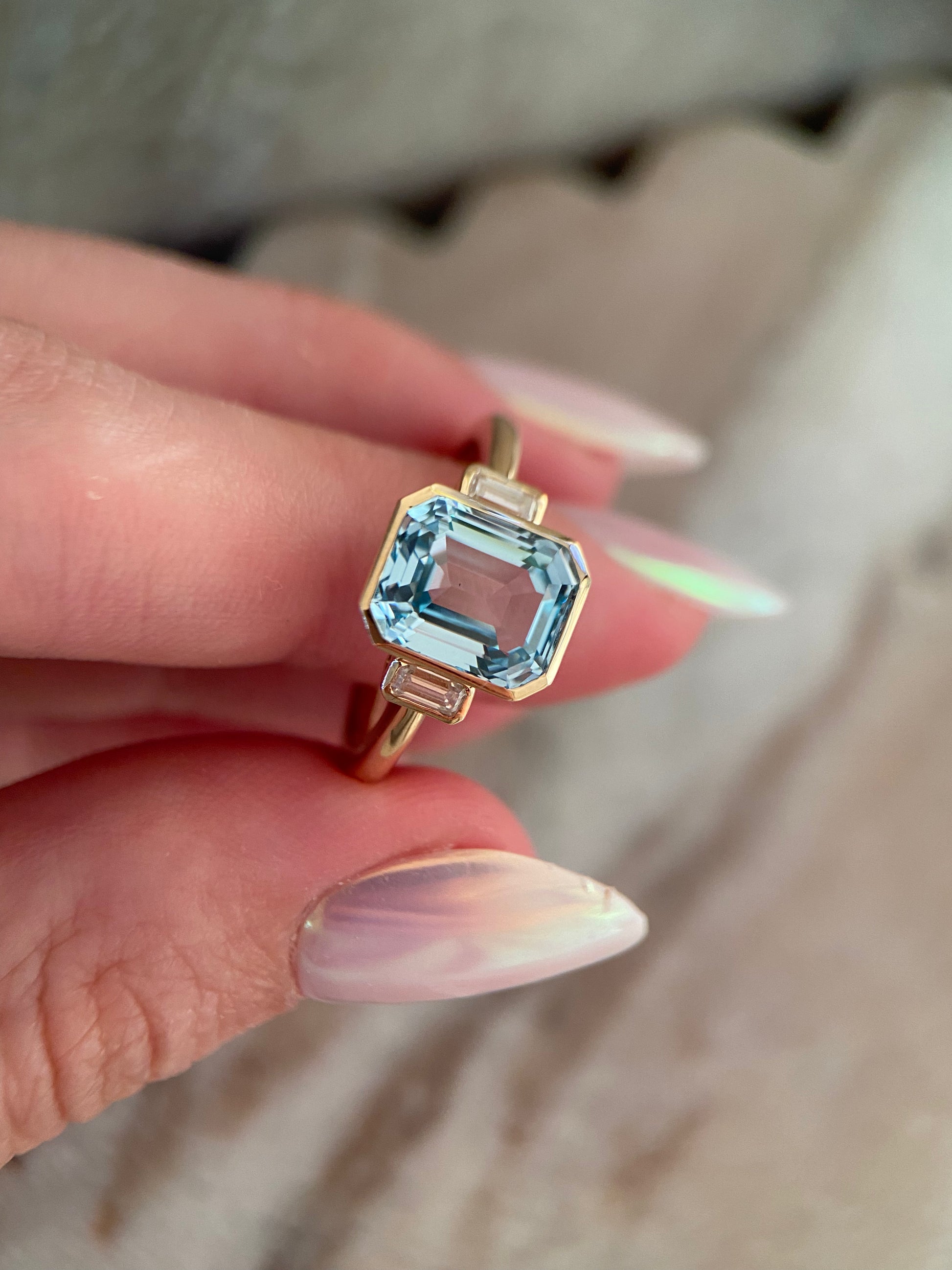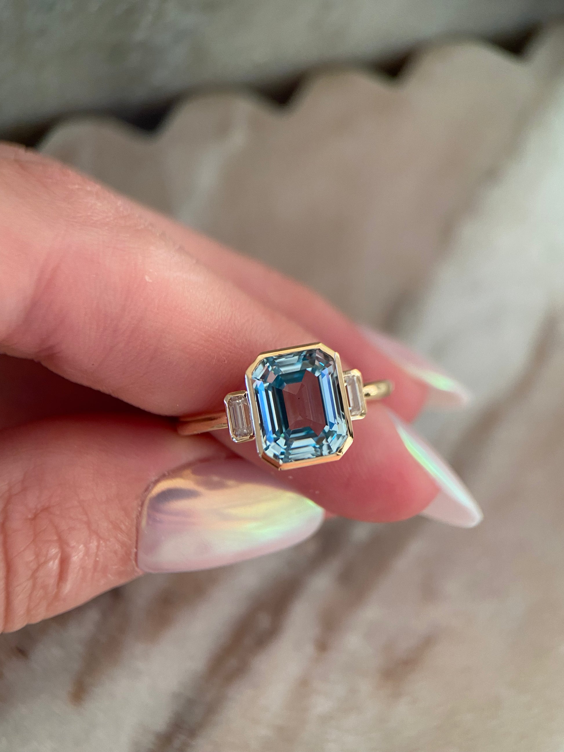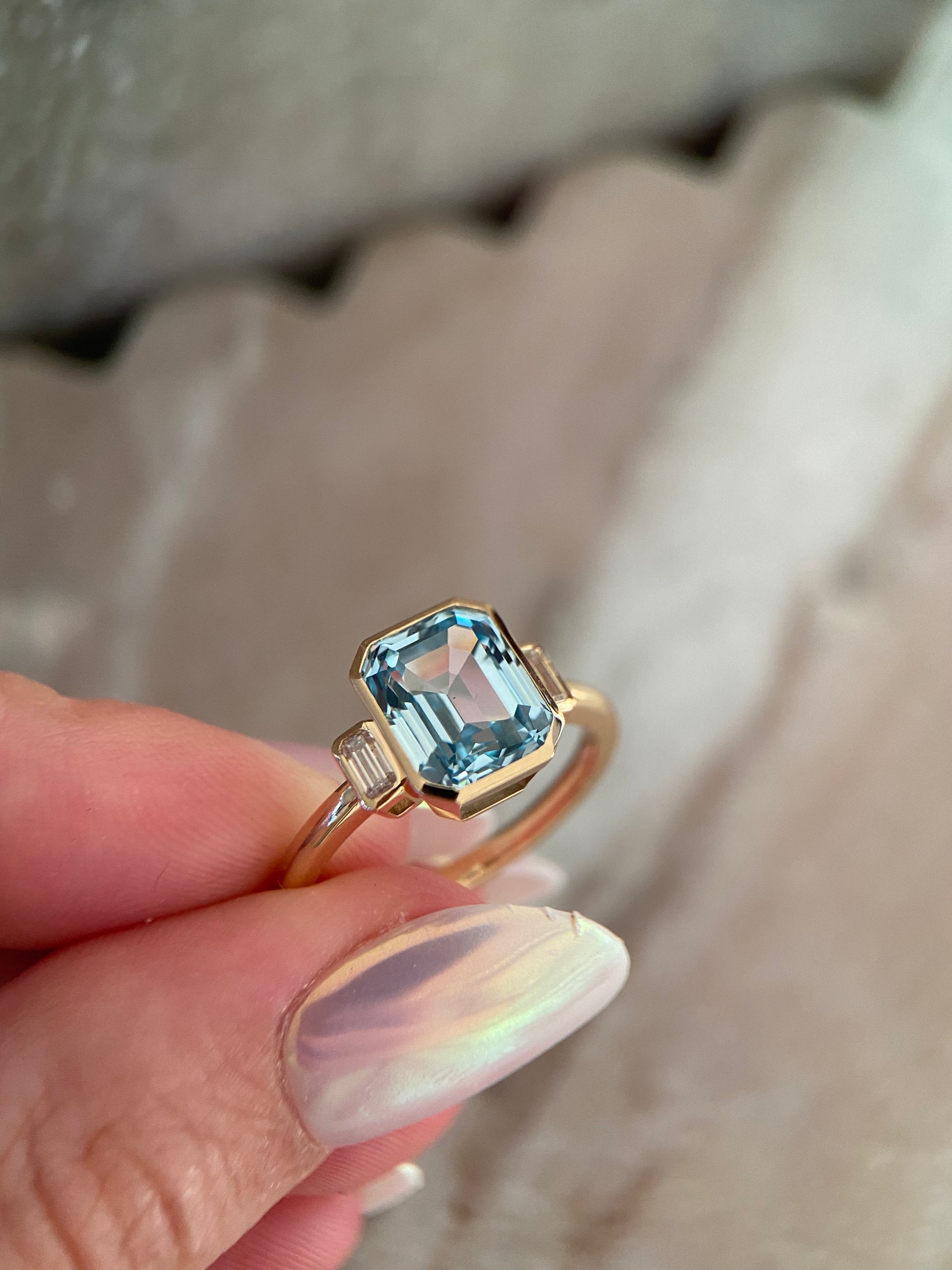 Stones: 8x10mm centre stone aquamarine emerald cut moissanite or lab diamond; two 2x4mm DEF emerald cut moissanites or lab diamonds.